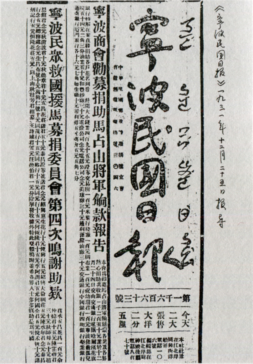 《宁波民国日报》1931年12月20日有关劝募饷款捐助马占山东北抗日的报道