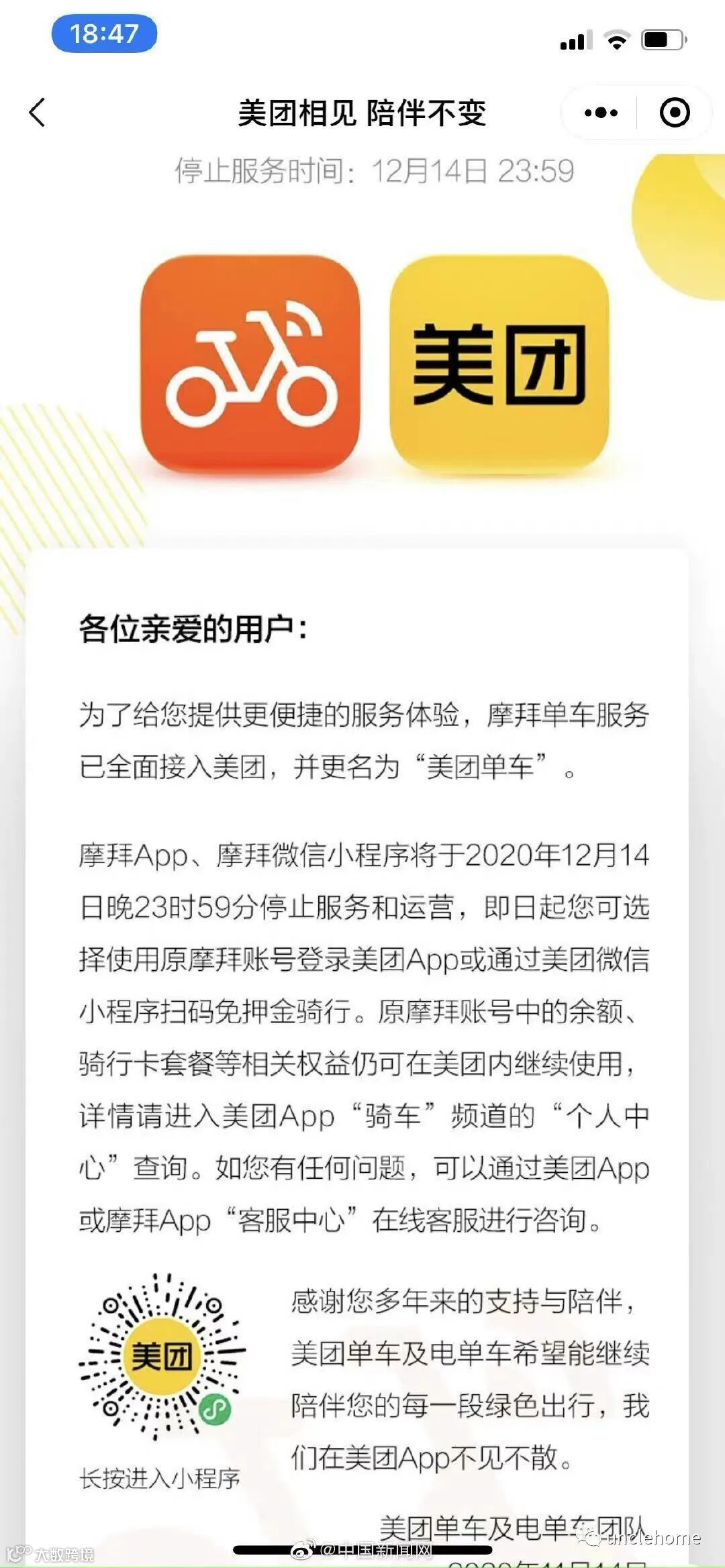 说现在摩拜的APP和小程序都停用,所有的东东都接到美团APP里面去了。