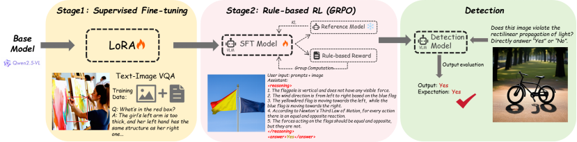 视觉语言模型在图像描述和视觉问答等多模态任务中取得了卓越进展,但其在识别明显违背物理常识的异常图像方面仍存在着显著局限性。为了解决这一问题,本研究首先构建了PhyVIB。PhyVIB是一个涵盖16,000张图像的视觉语言模型物理常识评估基准,旨在全面评估视觉语言模型对违背物理常识的异常图像的识别能力。在构建PhyVIB的过程中,本研究采用了一种基于扩散模型的迭代式微调与生成的图像合成策略,提高了合成图像的质量与多样性。接着,为了提升视觉语言模型对违背物理常识的异常图像的识别能力,本研究提出了一种双阶段模型强化框架PhyDetector。基于所构建的视觉语言模型物理常识评估基准PhyVIB,PhyDetector通过少样本监督微调和群体相对策略优化(GRPO)来强化视觉语言模型对图像中物理常识的分析与推理能力。大量实验结果表明,相比于现有最先进的视觉语言模型,经过PhyDetector强化的模型在识别违背物理常识的异常图像方面,有着显著的性能优势,验证了该框架在视觉物理常识分析与推理领域的有效性与广阔应用前景。