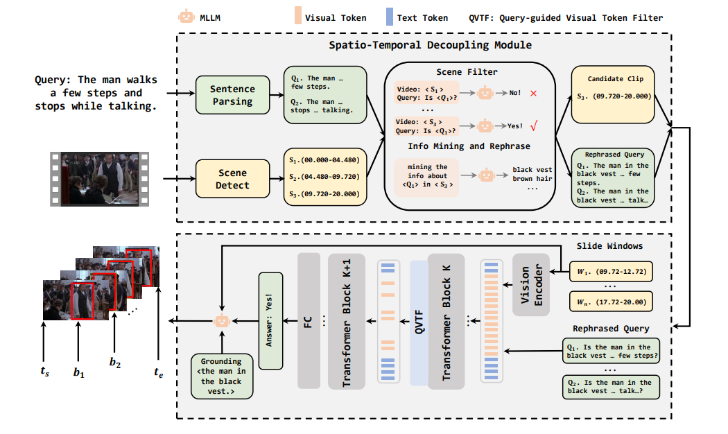 第二篇题为《RealVG: Unleashing MLLMs for Training-Free Spatio-Temporal Video Grounding in the Wild》(作者:魏红陈,陈震中)。时空视频定位(STVG)旨在根据文本查询在视频中定位特定物体或动作的时空区域。由于标注数据在数量和多样性上的局限性,现有方法难以有效泛化到现实场景。为此,该工作提出RealVG——一种无需训练的鲁棒性框架,通过问答机制利用强大的MLLMs实现开放环境下的STVG任务。针对复杂现实视频与查询语句带来的挑战,该工作设计了时空解耦模块和查询引导的视觉令牌过滤器:前者将复杂场景分解为简单子场景与子查询以降低理解难度,提升静态视觉元素的解析精度;后者通过过滤无关视觉令牌来强化目标对象的聚焦能力,从而改善短时动作感知。实验表明,在完全无需STVG训练数据的情况下,RealVG在现实场景中的性能显著超越现有全监督与弱监督方法,展现出卓越的适应性与鲁棒性。