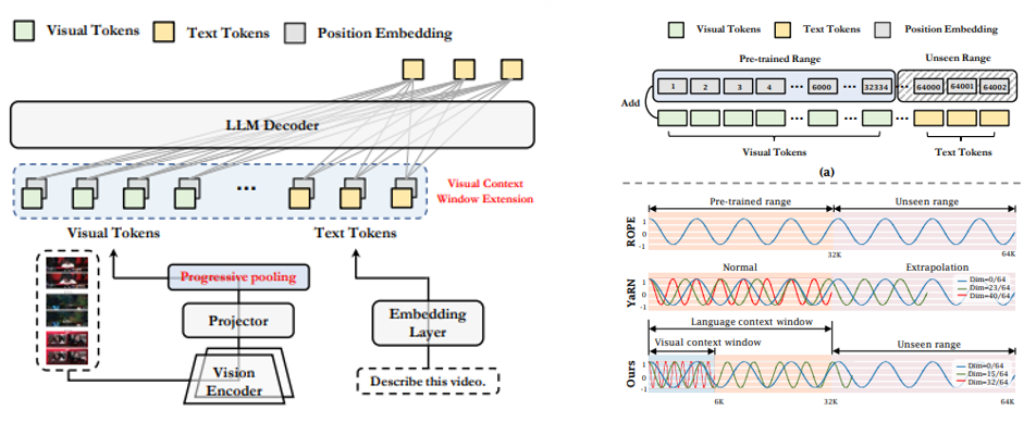 第一篇论文题为《Visual Context Window Extension: A New Perspective for Long Video Understanding》(作者:魏红陈,陈震中)。该工作从上下文窗口的视角切入,旨在无需长视频数据集重新训练的前提下,实现多模态大语言模型(MLLMs)对长视频任务的有效应用。该工作首先深入分析了预训练MLLMs难以理解长视频内容的原因:视觉与语言模态的差异导致两者标记的上下文窗口不匹配,使得直接扩展视觉标记以对齐语言上下文窗口存在固有困难。基于此发现,提出通过扩展视觉上下文窗口来适配长视频理解任务,从而避免大规模长视频数据的重复训练。为缓解长序列带来的显存压力,该工作进一步设计渐进式池化推理策略——通过动态调整帧嵌入的空间分辨率,在保留关键空间信息的同时显著减少视觉标记数量。在MLVU长视频理解基准上,仅7B参数的模型性能已超越GPT-4o。