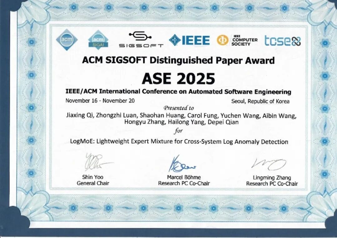 北航计算机学院中德所栾钟治团队题为《LogMoE: Lightweight Expert Mixture for Cross-System Log Anomaly Detection》的论文荣获IEEE/ACM SIGSOFT Distinguished Paper Award。这也是计算机学院师生连续第二年获此殊荣。此次获奖论文作者为计算机学院20级博士生齐家兴,计算机学院副教授栾钟治(通讯作者),计算机学院19级博士生黄绍晗,加拿大康考迪亚信息系统工程研究所副教授Carol Fung,计算机学院21级博士生王御臣、24级博士生王爱斌,重庆大学大数据与软件学院教授张洪宇,计算机学院教授杨海龙、钱德沛。