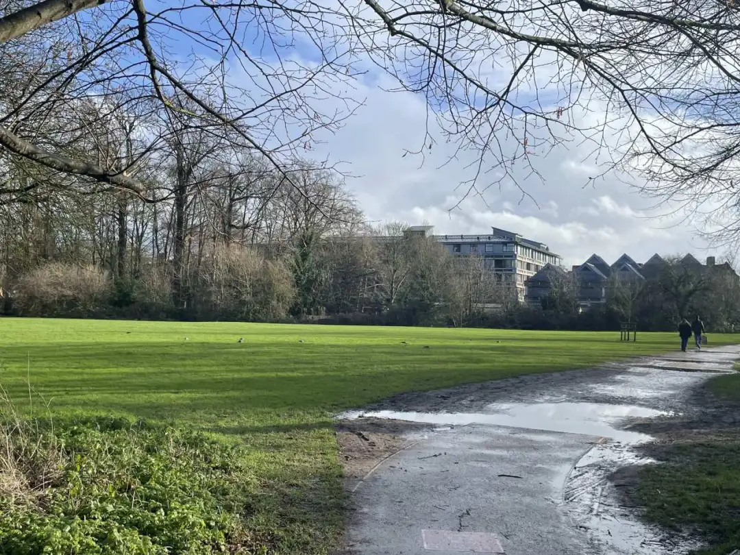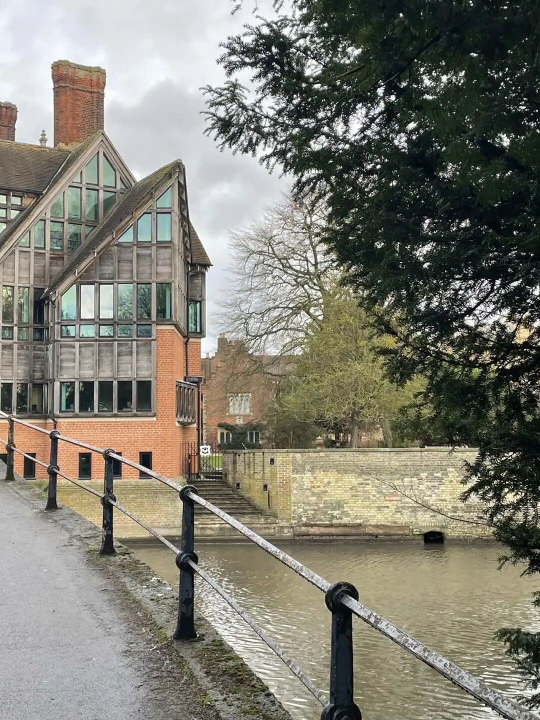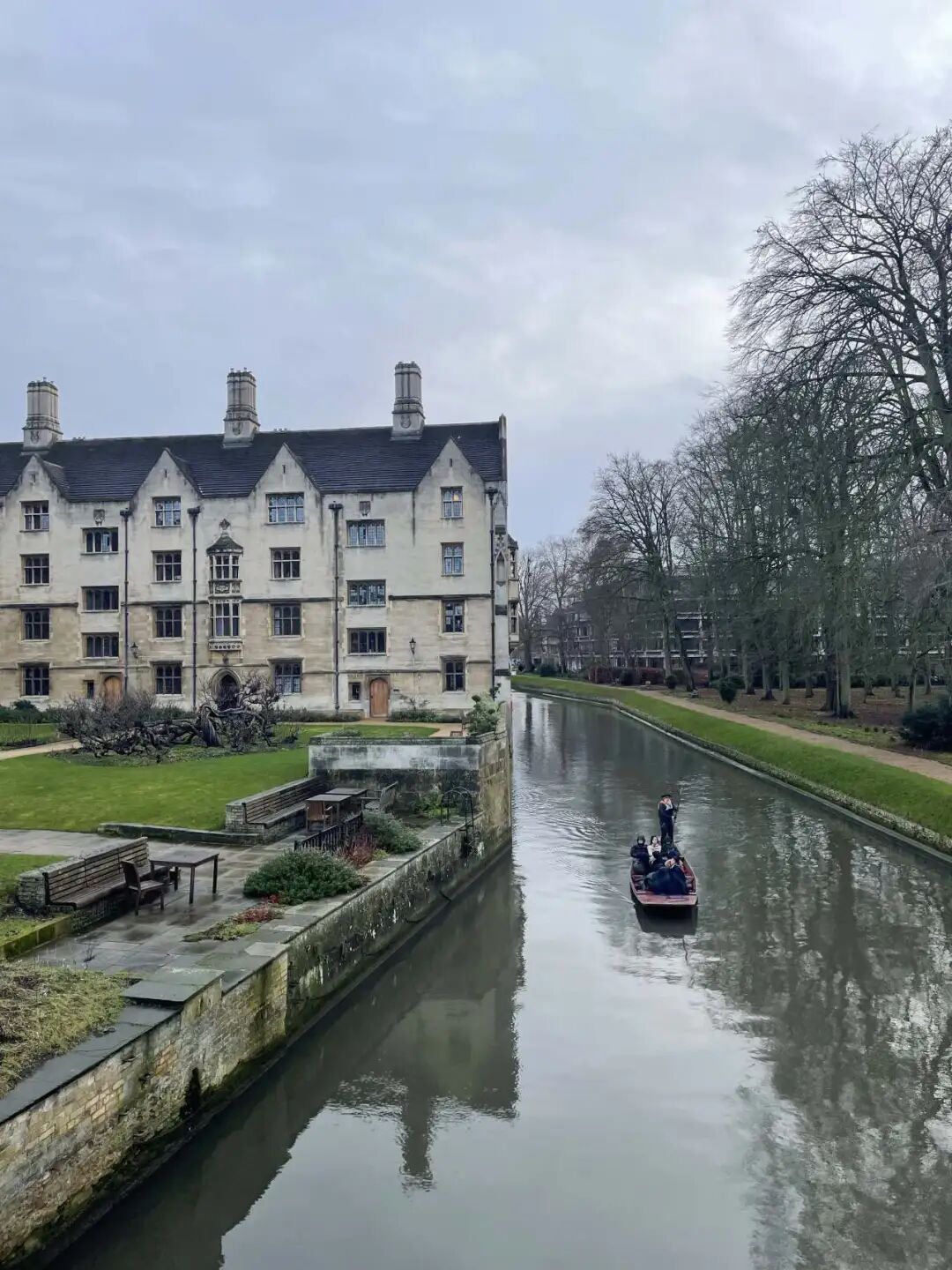 从国王学院的后门穿过一片绿意盎然的草坪,便来到了皇后学院。皇后学院最著名的建筑之一是“数学桥”(Mathematical Bridge),这座桥因其独特的设计和与牛顿的传说而闻名遐迩。