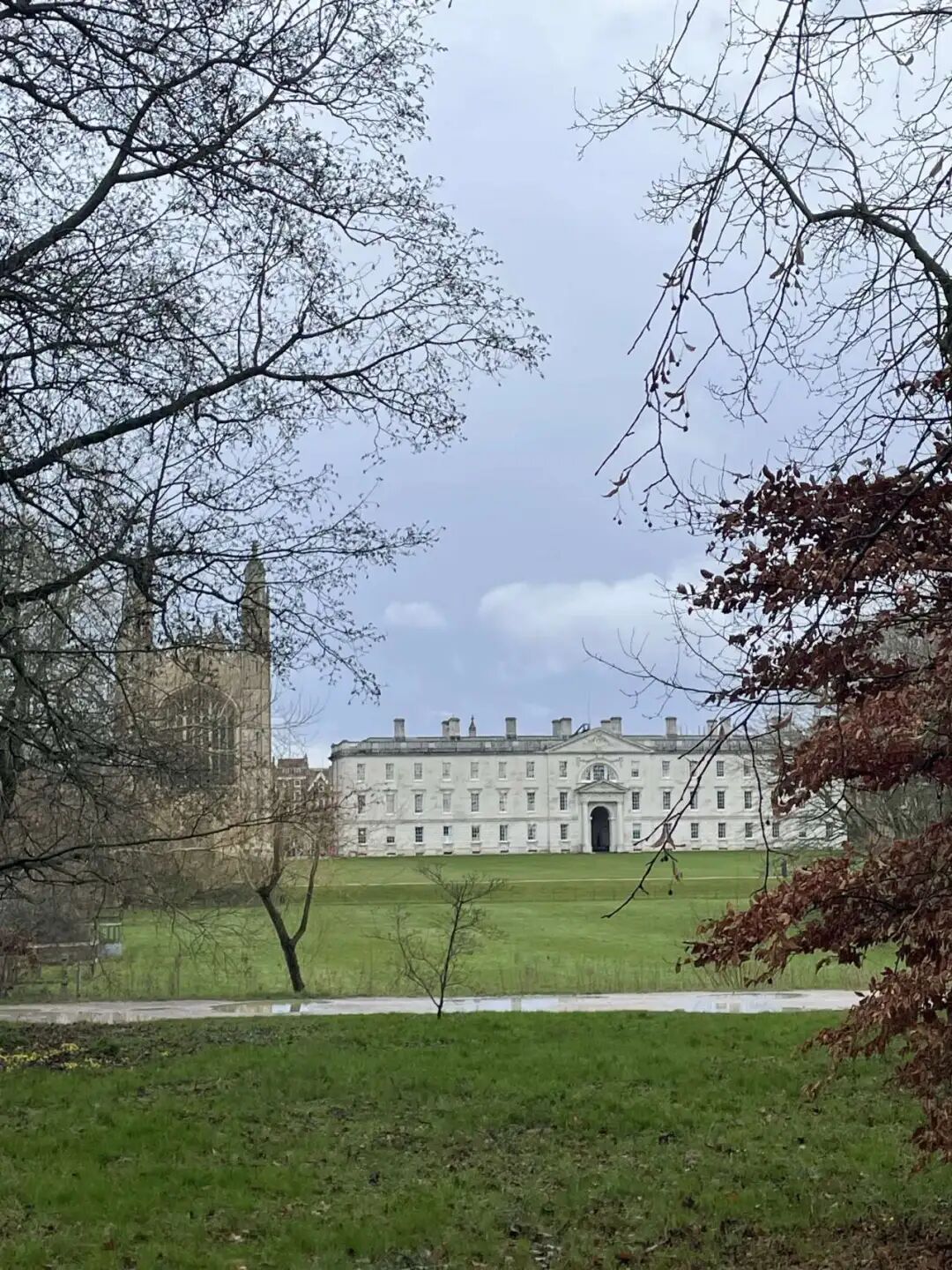 从国王学院的草坪望去,一座雄伟的尖顶门楼入口矗立眼前,其后是洁白的主楼与高耸的国王学院教堂。