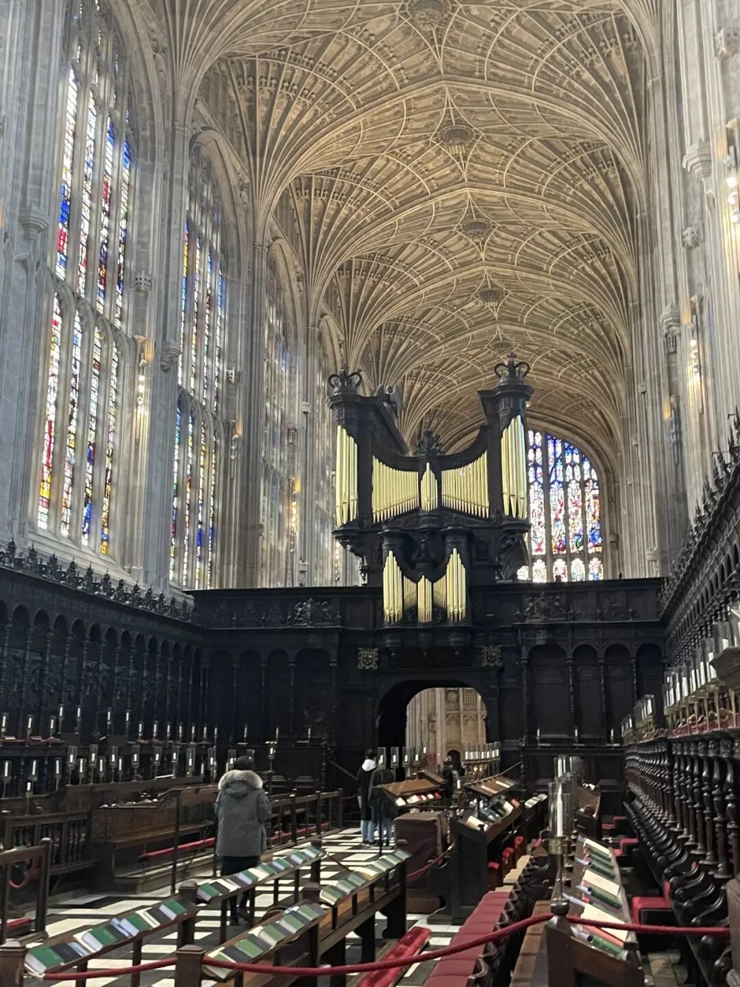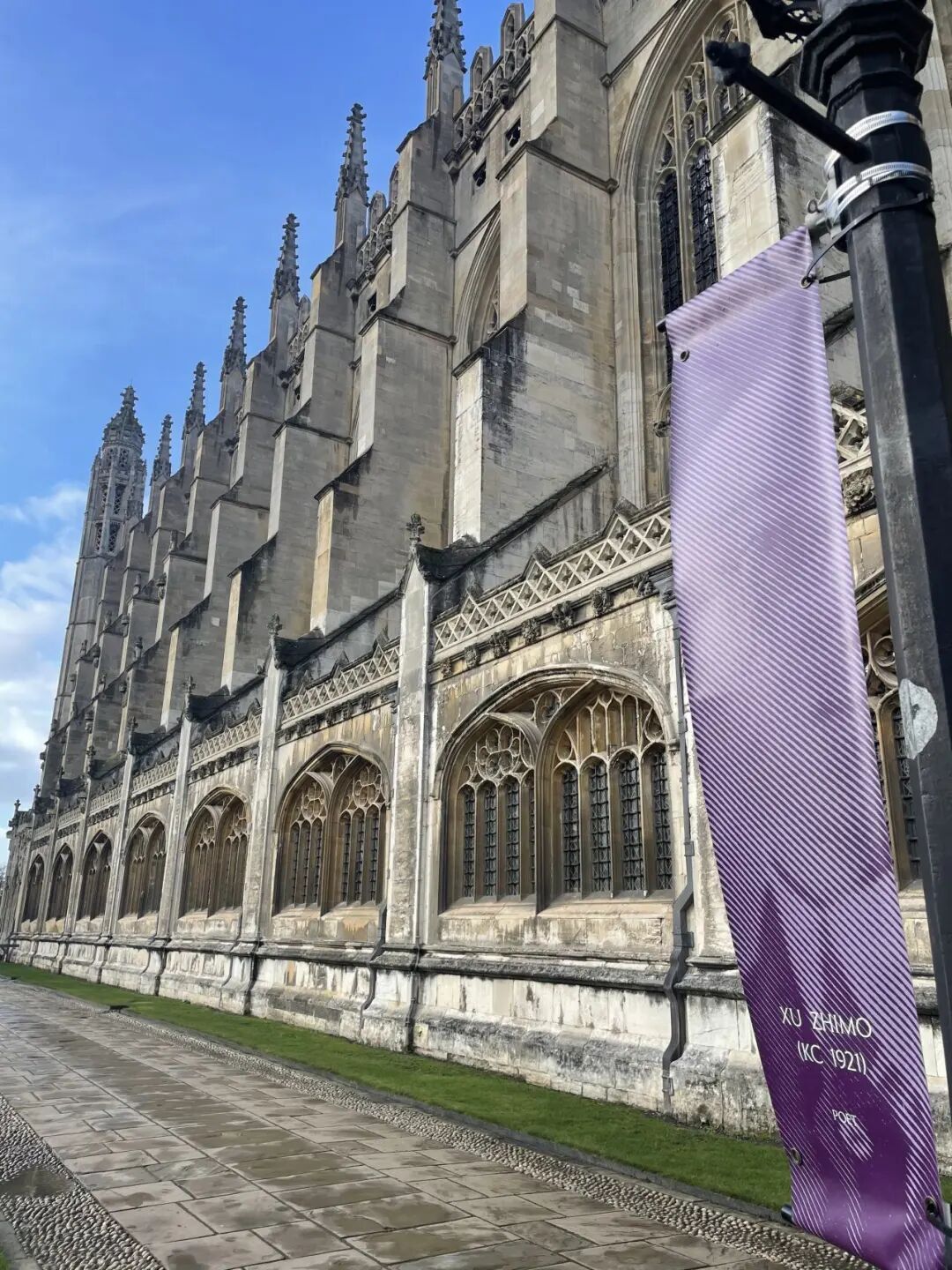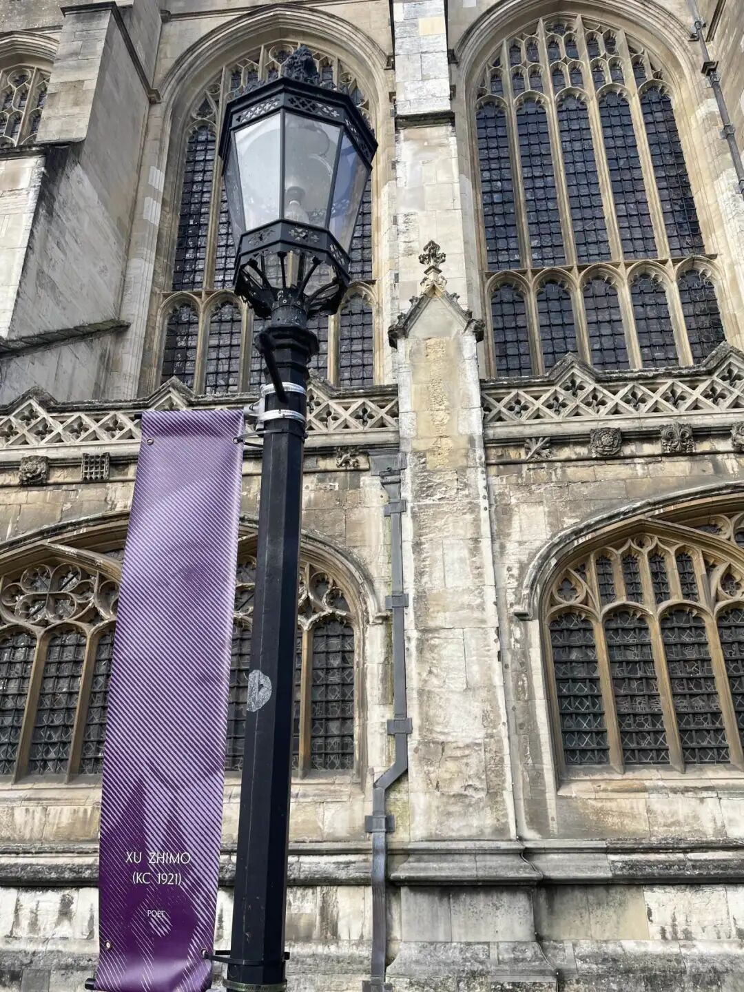 从国王学院雄伟的正门牌楼进入,右手边那座灰色建筑便是著名的国王学院教堂。教堂门口的校友旗帜上,赫然写着中国诗人徐志摩的名字。