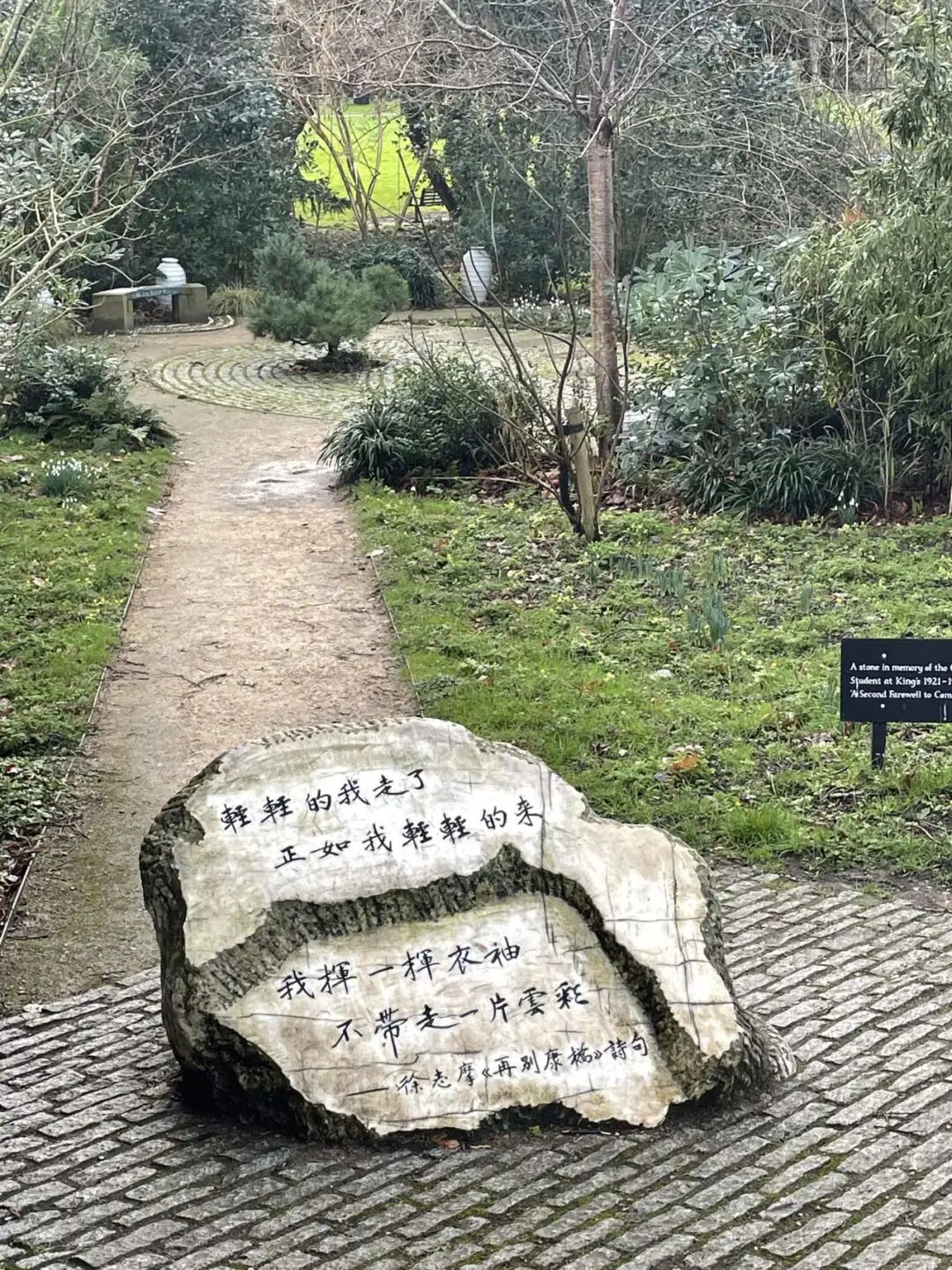 沿着小路前行,左边的石碑上镌刻着徐志摩的名篇《再别康桥》。石碑之后,便是风景如画的“徐志摩花园”。这座中式花园于2018年正式开放,是剑桥大学历史上第一座中式园林。