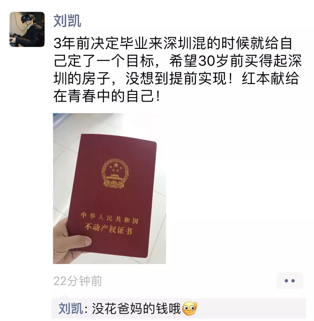 我和刘凯认识3年了,今年他买了深圳的房子,3年前他大学毕业,他说希望能在30岁前买得起深圳的房子,今天这个目标他靠自己早早就实现了。