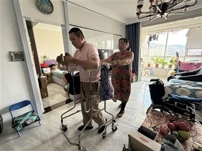 清晨的节奏从此变成“双线作战”。先给父亲擦身、换尿垫,用棉签蘸着温水擦口腔,再一勺勺喂流食;转身帮儿子做关节拉伸。父亲牙口不好,她就把蔬菜剁成泥、肉煮成糜,熬得烂烂的喂。“他爱吃面食,”盛国斌记得清楚,“有时候清醒了会说‘想吃饺子’,我哪怕忙到半夜,也会给他包,他能有喜欢的东西,我就开心。”