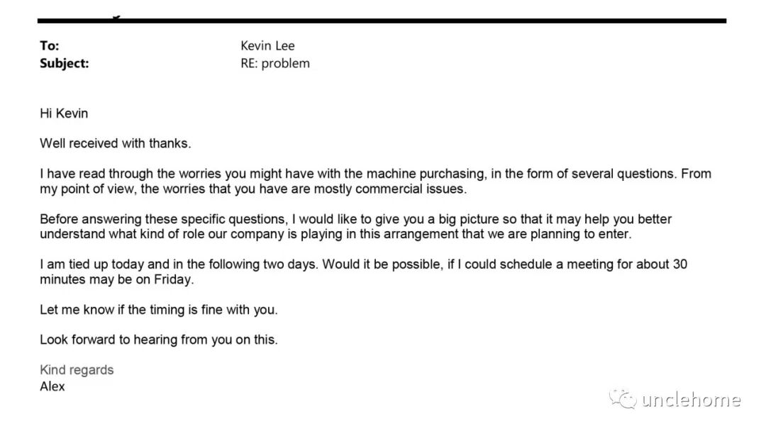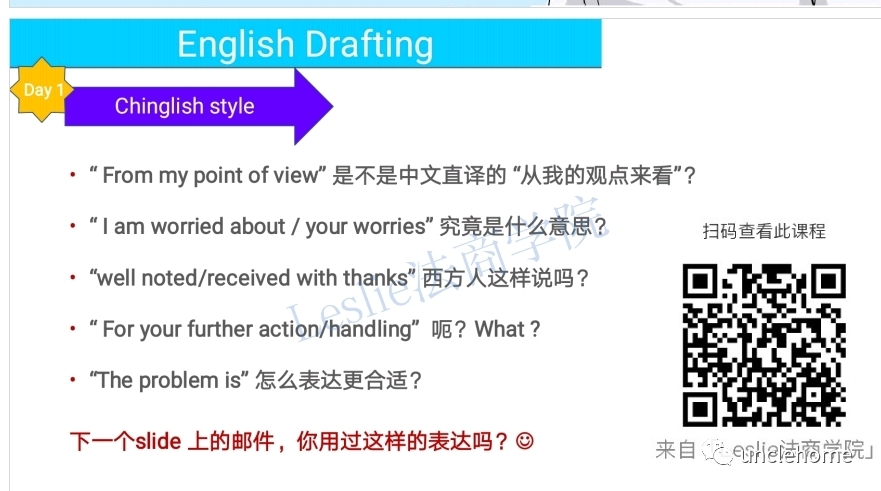 也有很多的时候读别人写的英文拍案叫绝,自己却写不出来? 写出来的邮件怎么看都像Chinglish? 自己撰写的英文文件总觉得表达不到位? 来,检视下自己的邮件,是否有类似的表达? 这些,是很多学位教育的痛点。 因为你不会在课堂上学到让你逼格满满,地道的、在国际商务、法律真实场景下的英文写作表达法。 你觉得下面这封邮件写得如何?