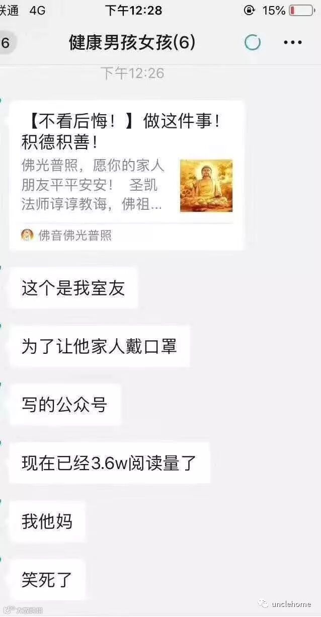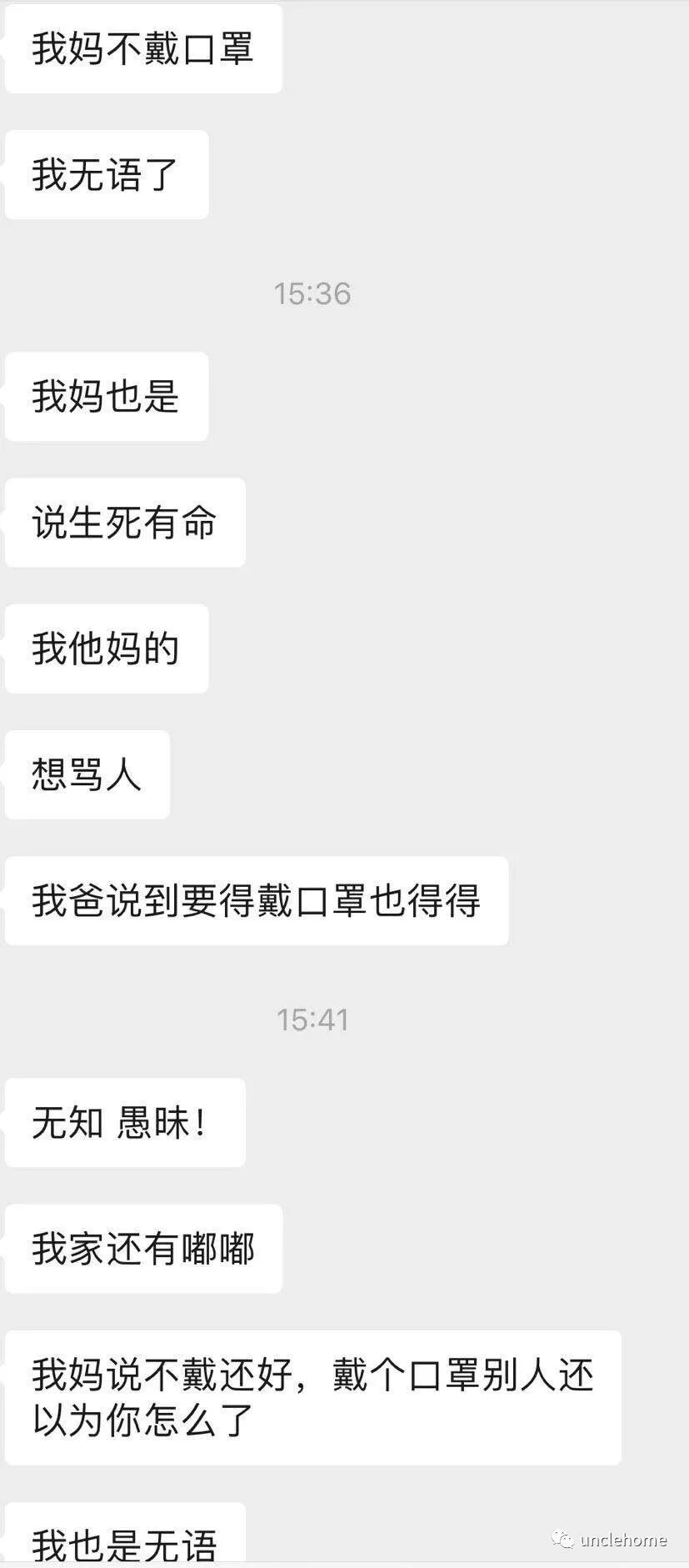 这几天疫情的问题,大家都很关注。回到家的很多朋友,开始了和家中长辈的斗法:如何让家中长辈出门带口罩,成了很多人的难题,甚至成为了和长辈争论的事儿。你看,Uncle就有个朋友群里的聊天是这样的: