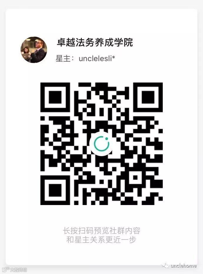考虑到确实有部分在企业工作的法务朋友有这方面的需求,或者只是单纯想交流法务职务经验、管理经验等,同时考虑到目前跨境并购实务圈的价格对于企业法务还是有一定的门槛(目前1000+/年,根据规则每超100人后还会有所提高),Uncle建了一个【卓越法务养成学院】,欢迎企业法务的朋友们加入,一起交流解答关于法务人士在职业、管理、企业合规管理等范畴内的问题。