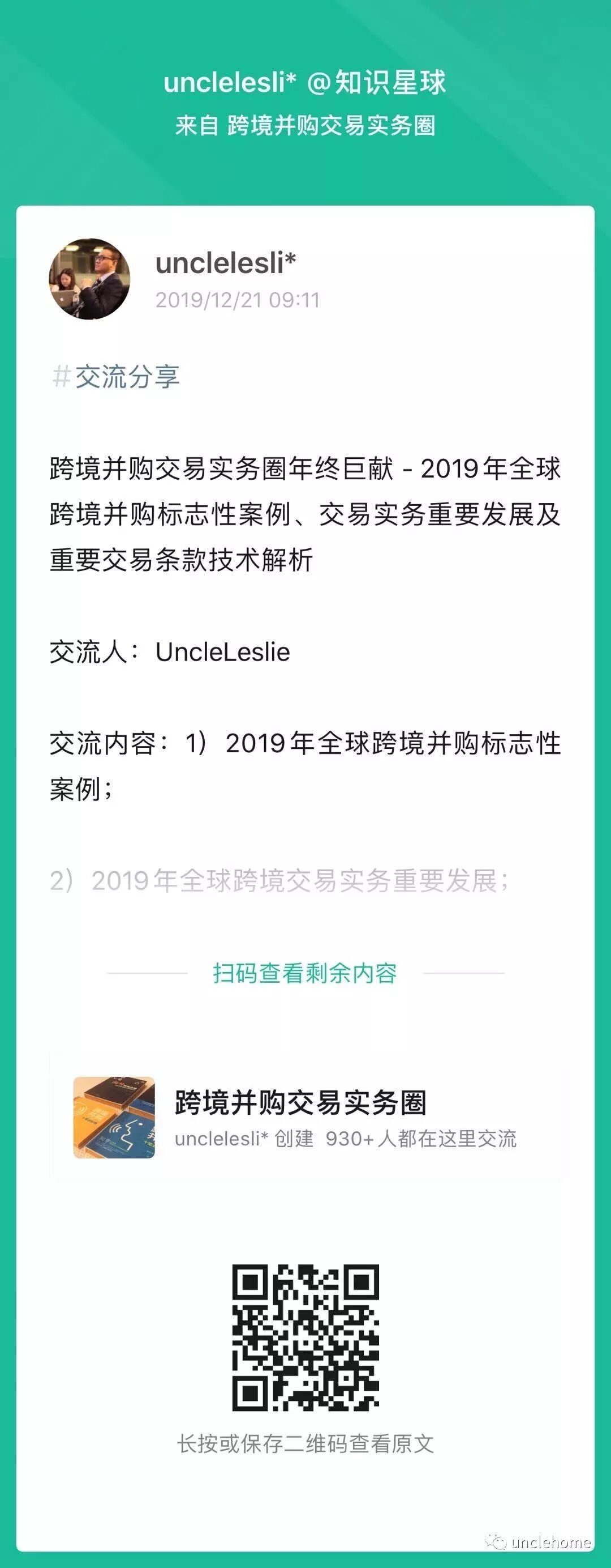 跨境并购交易实务圈年终巨献 - 2019年全球跨境并购标志性案例、交易实务重要发展及重要交易条款技术解析 交流人:UncleLeslie 交流内容:
