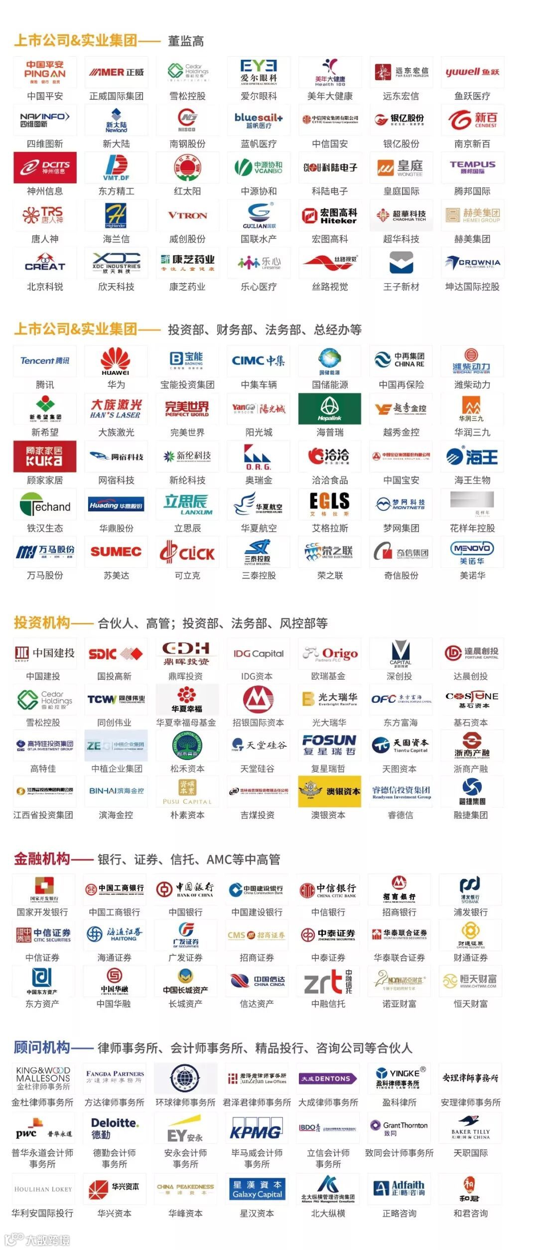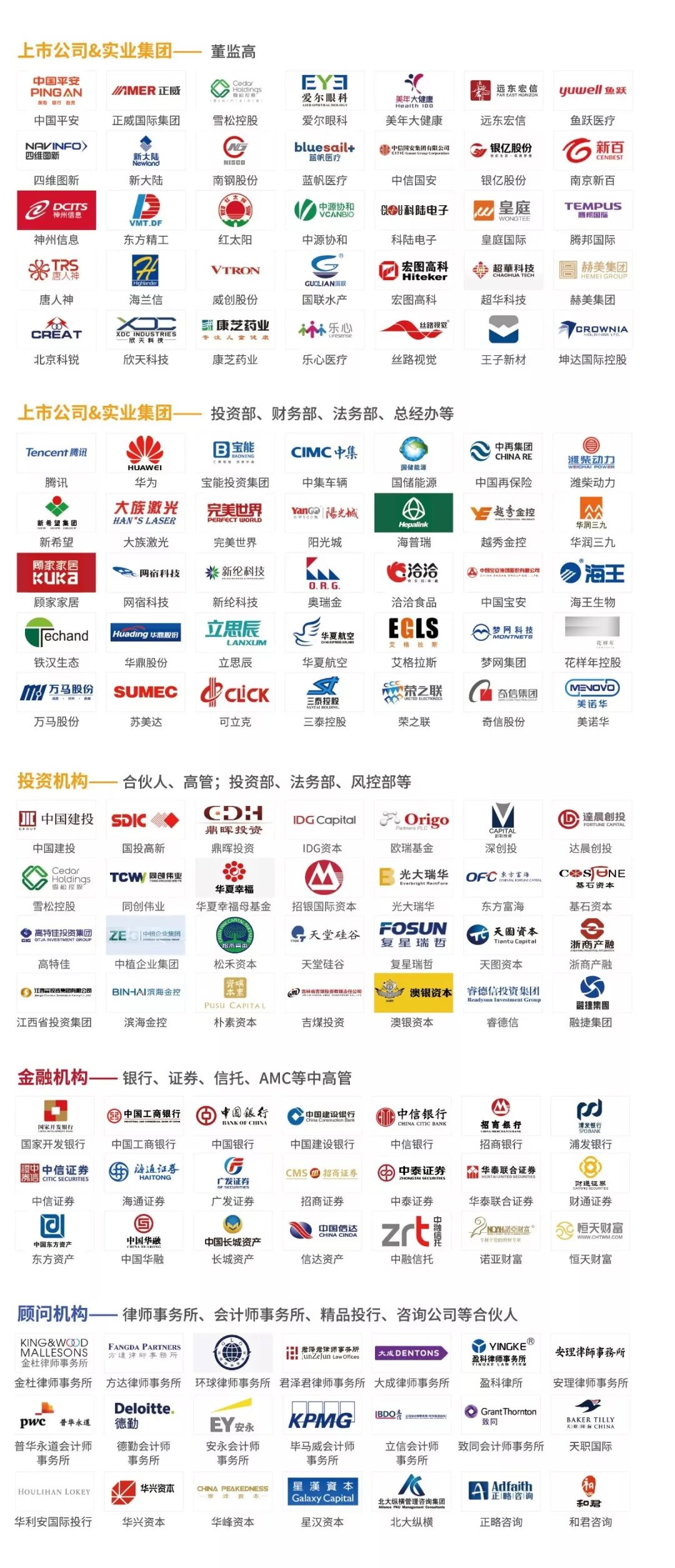 上市公司/实业集团实控人、董监高及投资并购部高管;新三板企业/优质非上市企业实控人、董监高及投资并购部高管;并购基金、产业基金创始合伙人、管理合伙人、合伙人及其他高管。