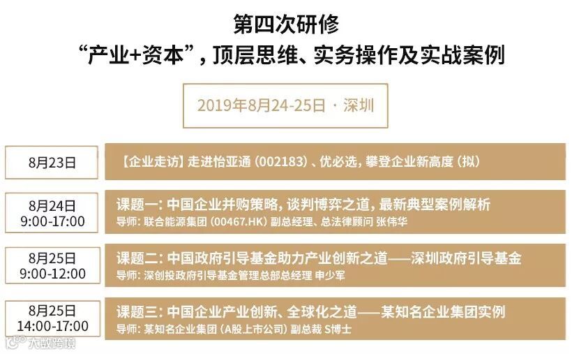 为此,我们特邀知名企业集团(A股上市公司)高管、深圳政府引导基金管理总部负责人、H股上市公司高管/跨境并购专家分别从产业方、资金方、专家顾问角度剖析“产业+资本”顶层思维,并以实战案例讲解企业战略、产业布局、产业创新、产业引导、产业并购,既有高屋建瓴的思考,又有脚踏实地的实务指引(含模拟谈判环节),还有业界的交流与碰撞,这个周末我们为您奉上一份以投资并购为核心的“产业+资本”精神大餐。