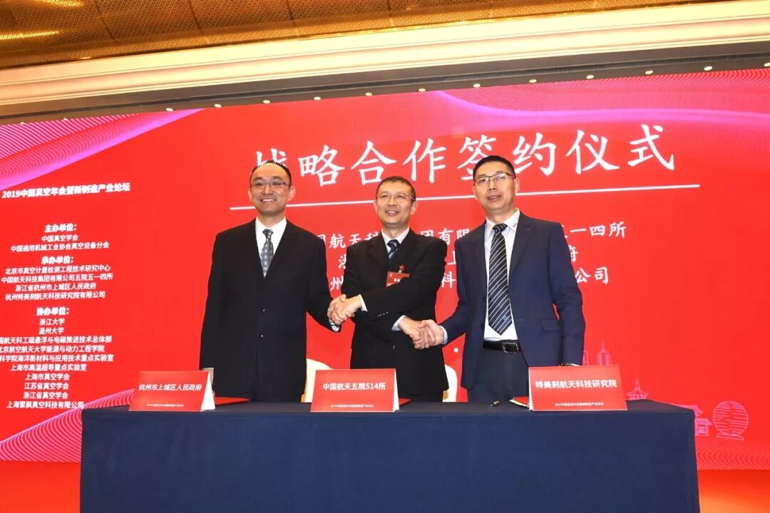 会上,中国航天五院五一四所、杭州市上城区人民政府、杭州特美刻航天科技研究院有限公司三方签订了落户协议,将共同以真空产业发展为契机,在杭州上城区携手推进真空技术在科技创新、技术应用、成果转化和人才培养等领域的全方位合作,填补杭州航空航天真空产业链空白。
