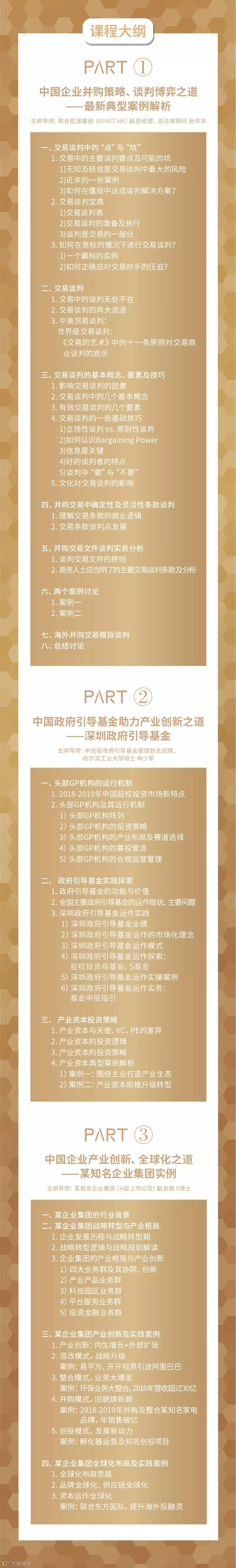如何理解产业环境?如何理解企业战略?如何在企业的产业布局下开展产业创新和全球化扩张?企业的投资并购如何开展?企业资源如何协同整合?并购交易错综复杂,并购风险如何防范?交易谈判如何开展?政府产业引导基金助力产业创新,引导基金如何运作?头部投资机构运行机制如何?产业资本投资策略如何?