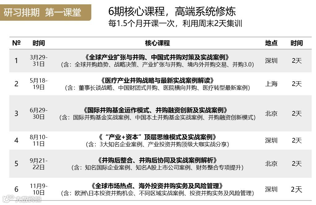 本次课程为《全球并购高级研修班》单次课程,报名《全球并购高级研修班》全年课程学费为:3万元(核心课程6选3+第二课堂),以下为《全球并购高级研修班》全年课程排期: