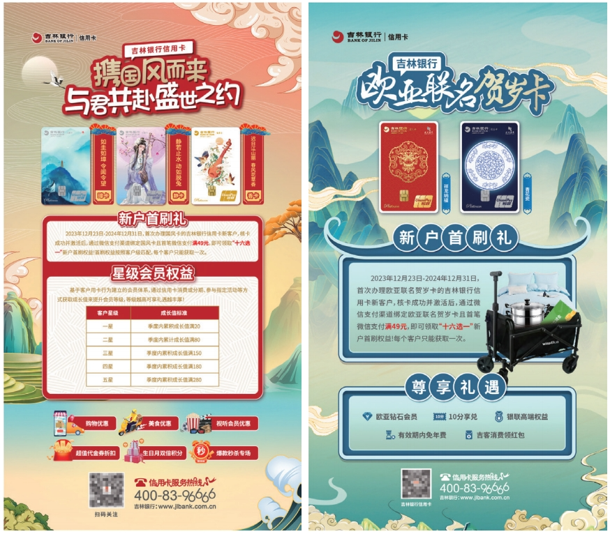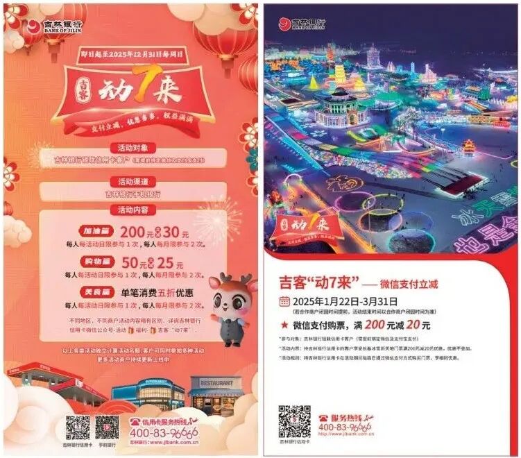 2024年被定义为“消费促进年”,吉林银行信用卡秉承“金融为民”服务宗旨,启动了吉客“动7来”全年特惠活动,搭建多样化用卡场景,提供多重福利补贴,活动覆盖出行、商超、餐饮、文旅、金融五大领域,合作门店1500余家;同时,为营造热闹的新年氛围,2025年春节期间,吉林银行信用卡延续“联动十一城”年货节品牌活动,将“金融有温度”服务理念贯彻到日常生活,为持续释放消费潜能添劲增力。