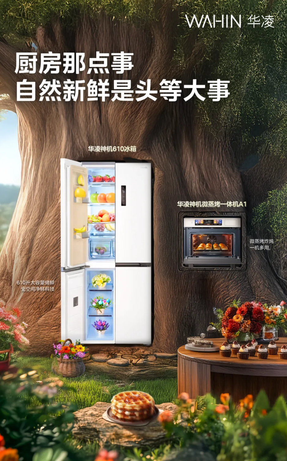 在产品核心卖点与场景特征的呈现上,展现出“大道至简”的极致思维。例如,将冰箱产品“通过AIGC技术将610升大容量储鲜和全空间净鲜科技”转化为“厨房那点事,自然新鲜是头等大事”的叙事语言,使消费者更易理解产品价值。