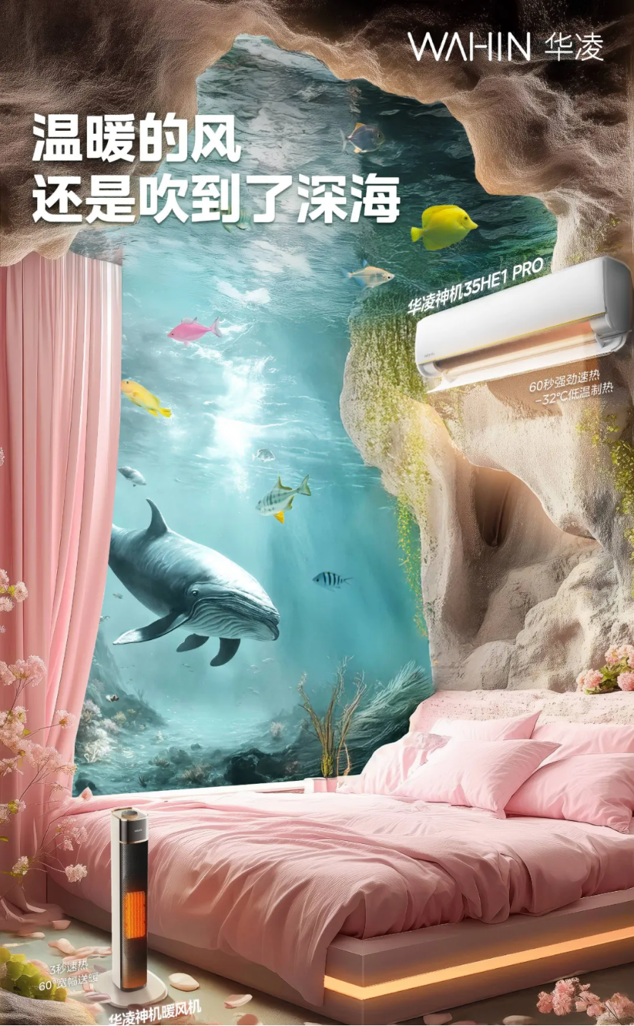 从深海暖风,到厨房新鲜事。这些AI加持的创意表达不仅完成了产品力的具象化升级,也吸引到了大批消费者的关注。暖风机、空调、冰箱......华凌以AIGC加码“神机”硬核产品力的不断释放,不仅为后续的大规模用户共创活动奠定基础,也为华凌技术优势在消费端的进一步感知和转化抢占先机。