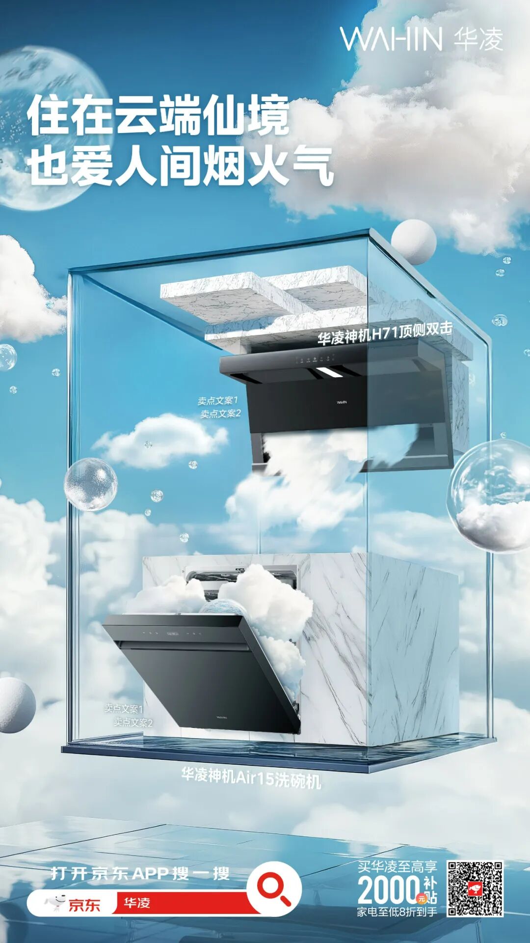 其他诸如空调产品的“华凌神机超AI,大导风板吹风才爽,国补8折到手更爽”;暖风机的“温暖的风,还是吹到了深海,华凌神机暖风机,3秒速热,宽幅送暖,8.5折到手心暖暖”等传播文案,清晰传达了产品优势和优惠信息,进一步放大产品功能,直击功能及价格优势。