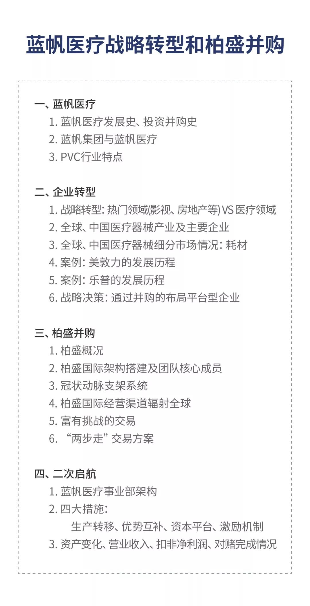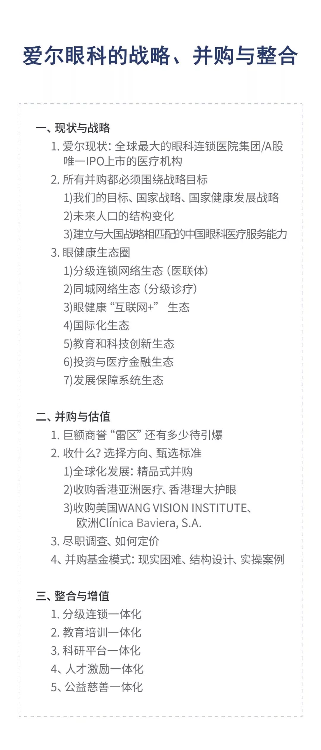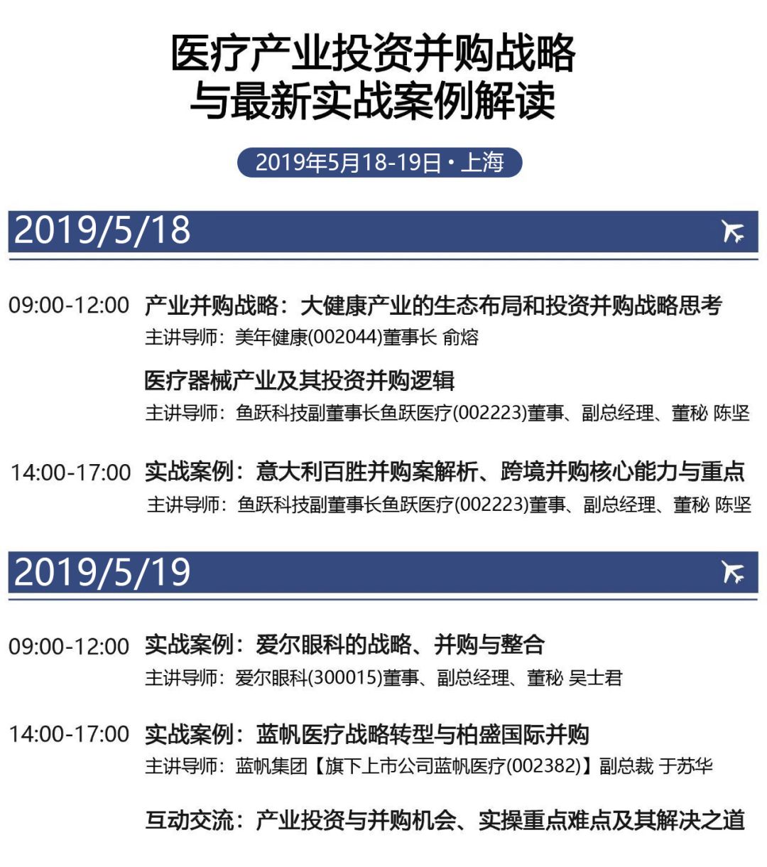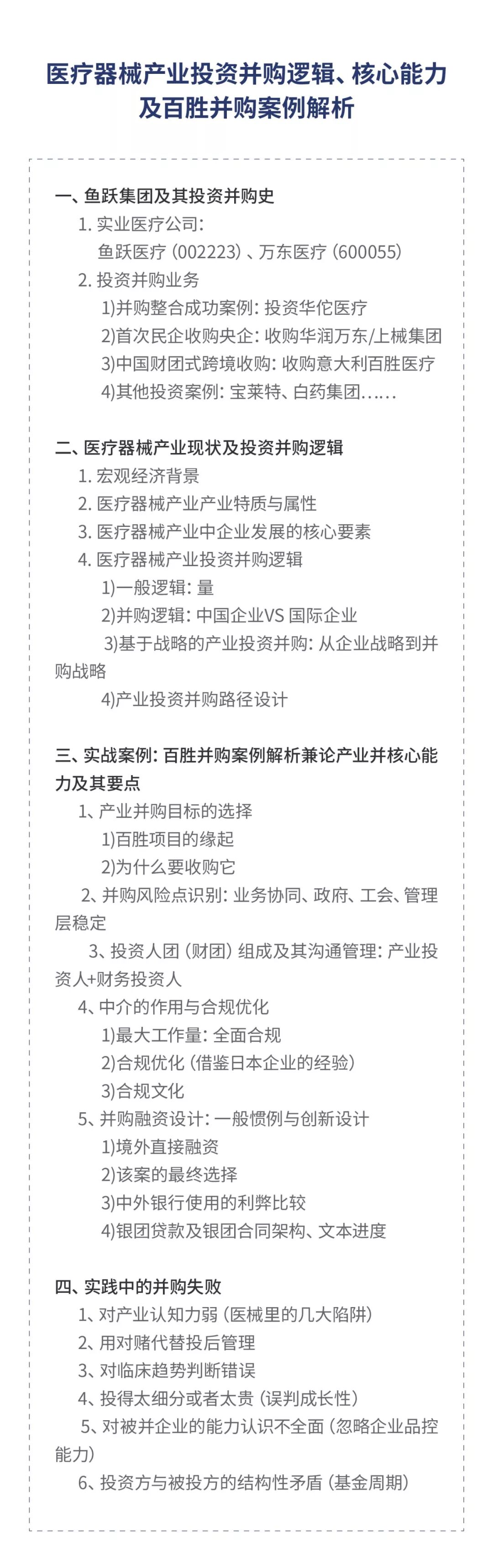 本次课程以四家企业投资并购史为基础,涵盖美年健康(002044)收购慈铭体检、鱼跃医疗(002223)收购百胜医疗、爱尔眼科(300015)收购Clínica Baviera、蓝帆医疗(002382)收购柏盛国际等市场热点案例,首次集中披露实战心得。