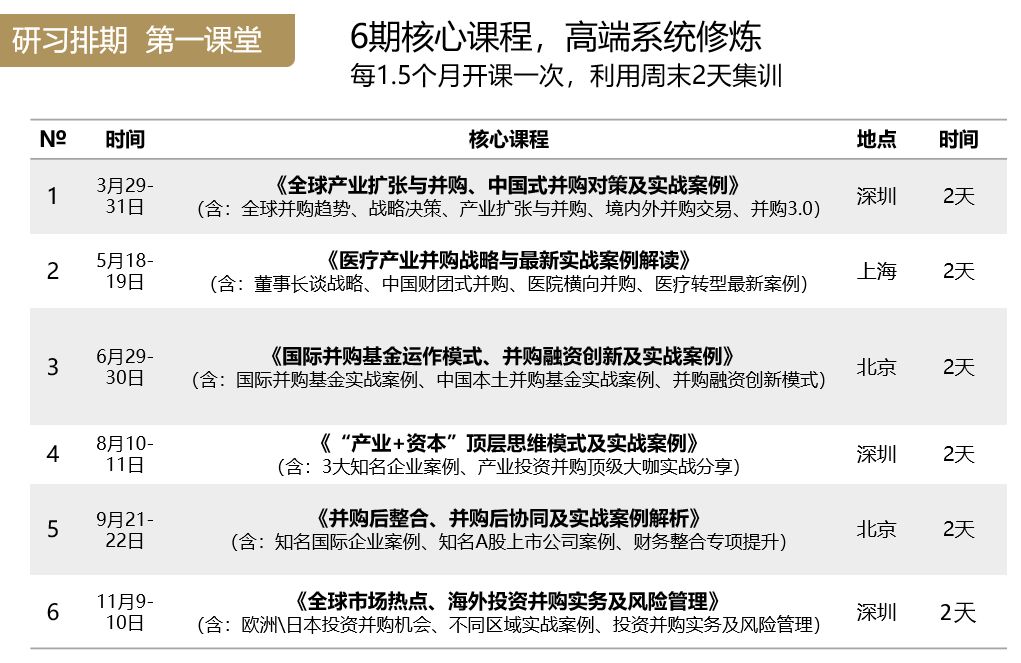 本次课程为《全球并购高级研修班》单次课程,报名《全球并购高级研修班》全年课程学费为:3.98万元(核心课程6选4+第二课堂),以下为《全球并购高级研修班》全年课程排期: