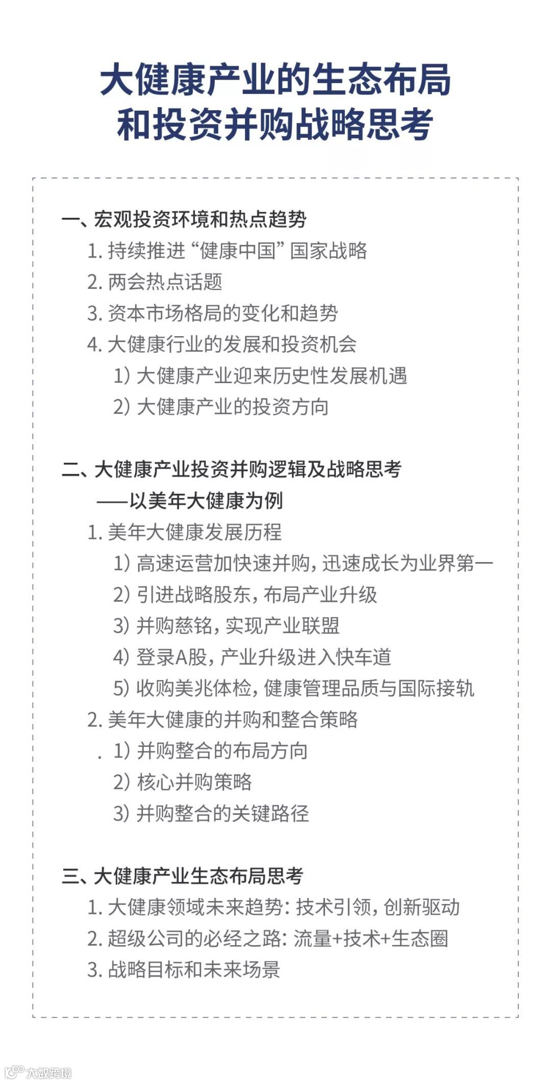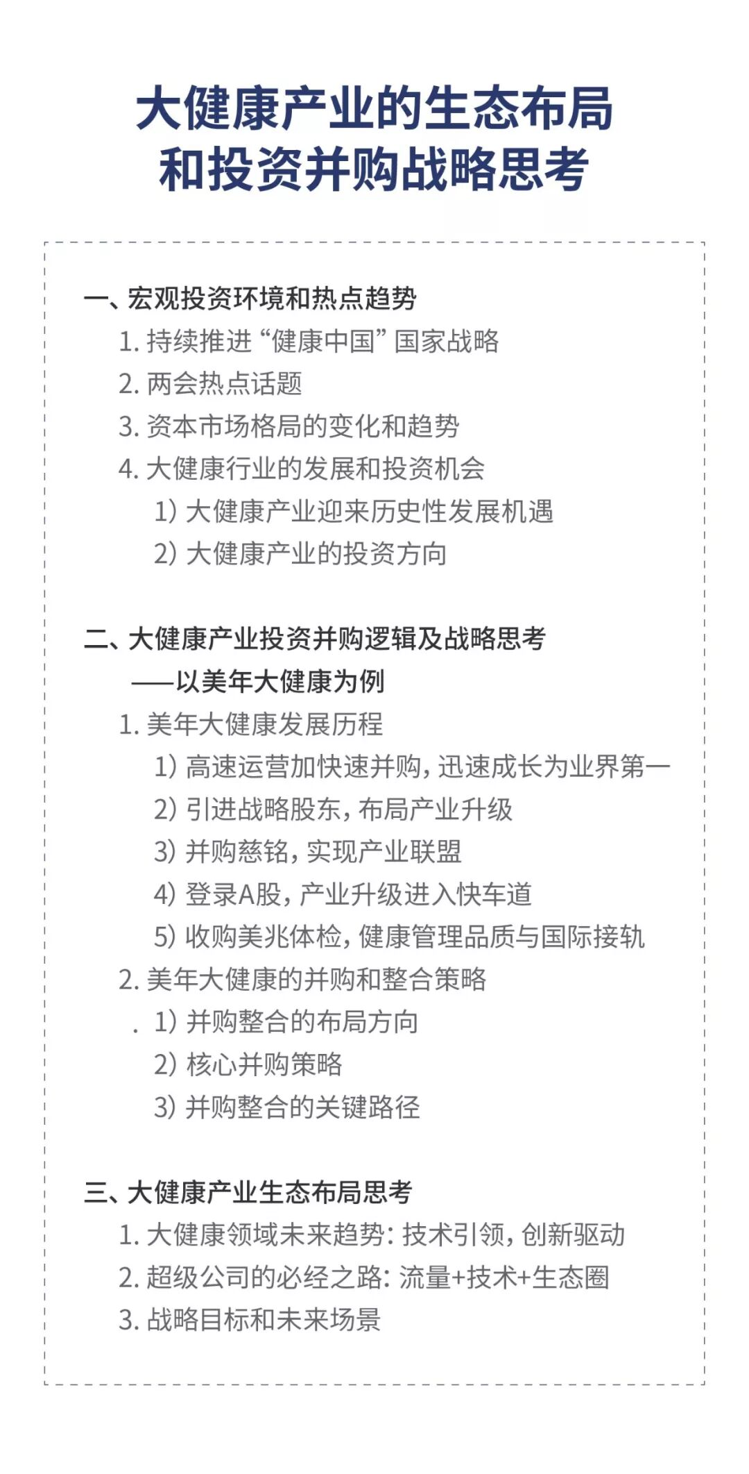 本次课程聚焦具有万亿规模的医疗健康产业,涵盖医疗器械、专科医院、健康体检等领域,分析产业趋势,展现产业投资并购机会,剖析产业投资并购逻辑;