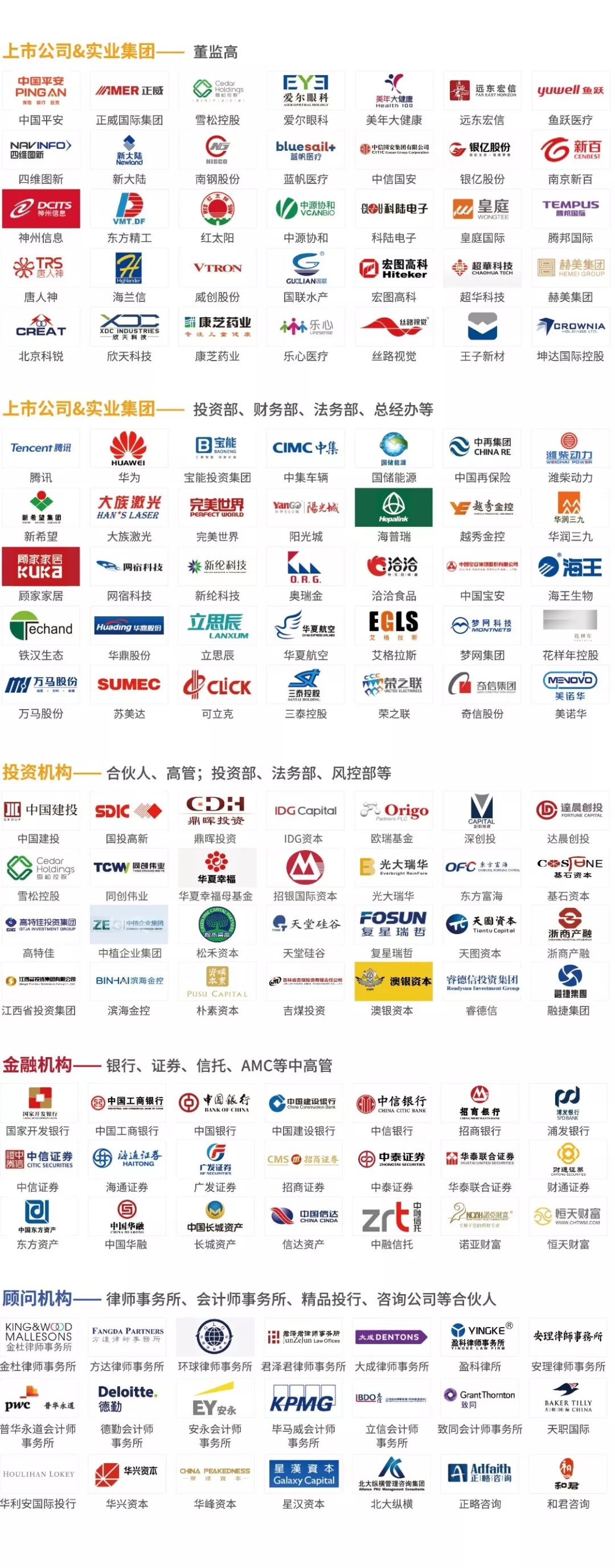 上市公司/实业集团实控人、董监高及投资并购部高管;新三板企业/优质非上市企业实控人、董监高及投资并购部高管;并购基金、产业基金创始合伙人、管理合伙人、合伙人及其他高管。