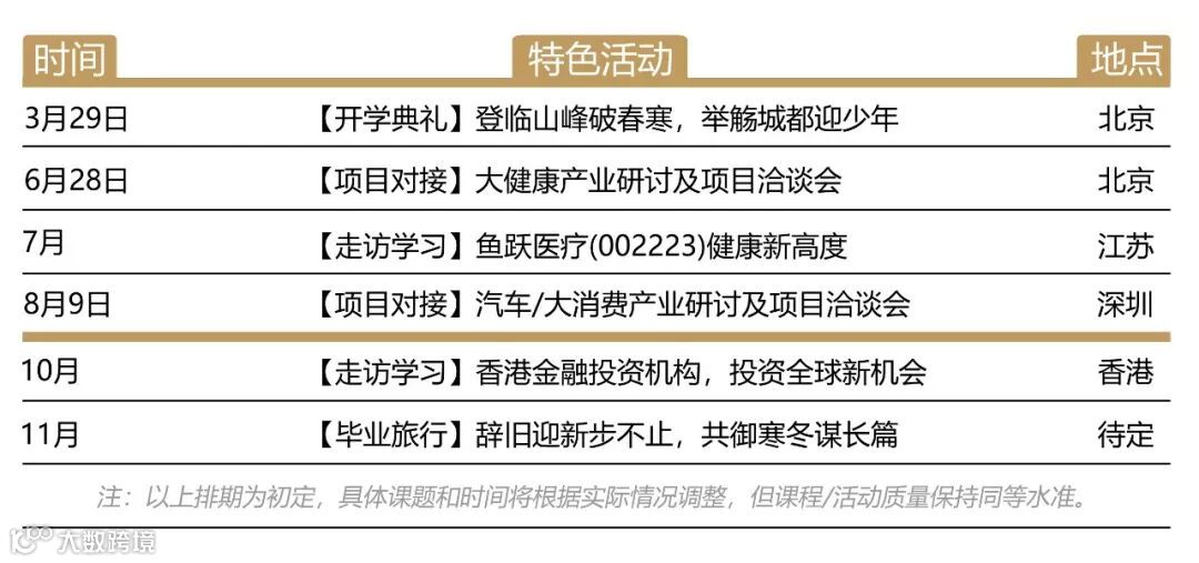 学制安排: 学制1年 ,第一课堂6次核心课程(每次集训2天)+第二课堂6次课外活动(含开学典礼、产业研讨暨项目对接会2次、企业走访学习2次、特色毕业旅行1次)+1次海外游学考察(选修)。