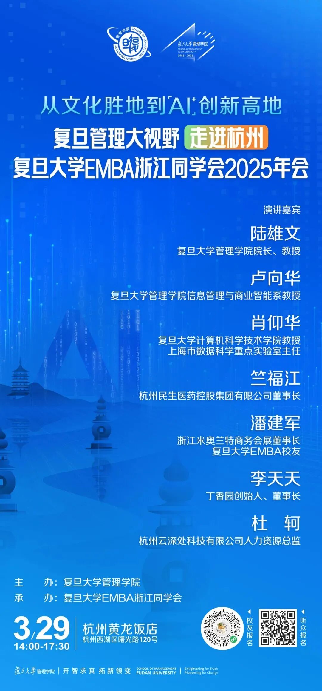 今年,是复旦大学建校120周年,也是复旦管院恢复建院40周年。3月29日,复旦大学管理学院将举办“复旦管理大视野走进杭州暨复旦大学EMBA浙江同学会2025年会”。本次论坛旨在探讨如何通过AI+引领产业变革,在保持中国文化输出重要窗口地位的同时,发掘杭州科技创新与产业转型的新动力。