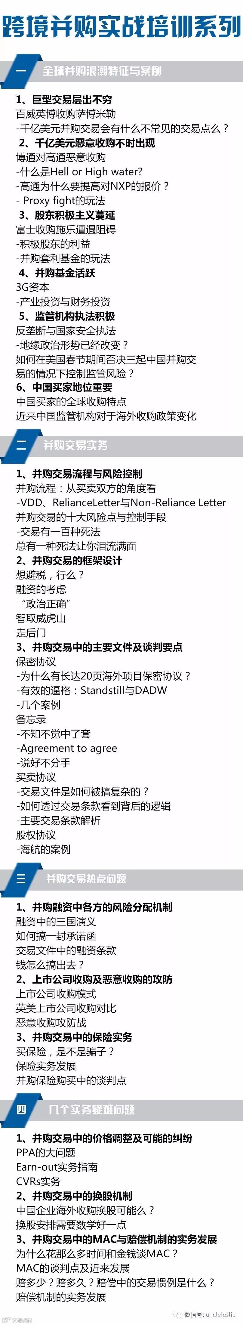 所谓的大行、魔法圈、白鞋所、4大等外部专业机构是不错,但是如果要请这样的外部顾问,费用高一定是少不了的。所以对于公司来说,在不同性质的交易中聘用合适的外部顾问就很重要,比如在澳洲、加拿大或者巴西进行中小额度的并购交易,其实聘用当地不错的外部顾问就可以了。在巨型、复杂交易中,请大行、魔法圈、白鞋所、4大专业机构可以在很大程度上控制好交易风险,顺利推进交易。一个值得注意的问题是,除了要选择合适的外部专业机构之外,合适的外部顾问团队也非常重要,一个了解行业,知道公司需求,和公司沟通顺畅的外部顾问团队是非常重要的。