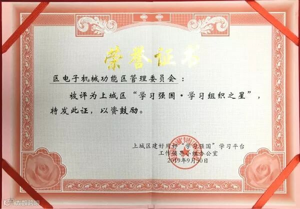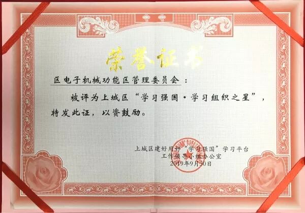 日前,上城区建好用好“学习强国”学习平台工作领导小组办公室评选出了上城区一批勤学习、爱学习、乐学习的家庭、组织和个人,并决定对5户“学习家庭之星”、20名“学习个人之星”、10个“学习组织之星”予以通报表扬。上城区电子机械功能区管理委员会被光荣评为学习组织之星。