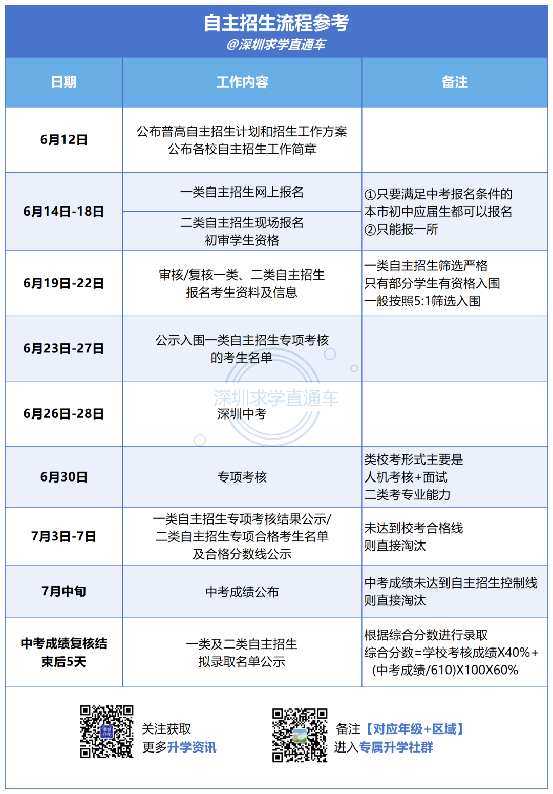 参考2024年,深圳高中自主招生招考节奏依次是招生计划公布→自招报名→入围筛选→名单公示→(中考)→专项考核→考核结果公示→(中考成绩公布)→拟录取名单公示→录取。