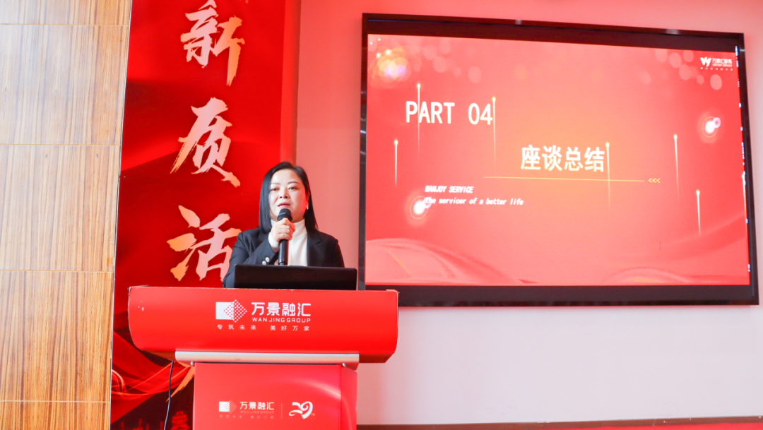 会议最后,万景汇物业集团总经理刘利女士发表总结讲话。她指出,万景汇的成长和发展离不开广大业主长期以来的信任和支持,万景社区向美向好建设需要广大业主积极监督、建言献策。未来,万景汇将与时俱进、科技赋能,不断提升物业集团的企业核心竞争力、客户服务能力和行业服务口碑;以业主满意为抓手,不断增强业主的舒适感、获得感和幸福感。
