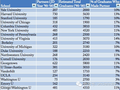 统计的Base是1990-2000之间从米国TOP 20法律院毕业的JD中得来的数据,伯克利、杜克貌似稍惨,芝大、弗吉尼亚和哈佛的比例数据占优,从成为Par的人数上来看,哈弗、乔治华盛顿和乔治城、扭腰大学人数都挺多。