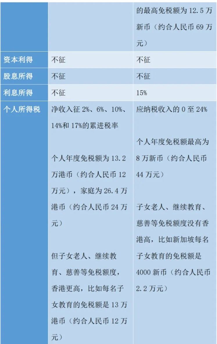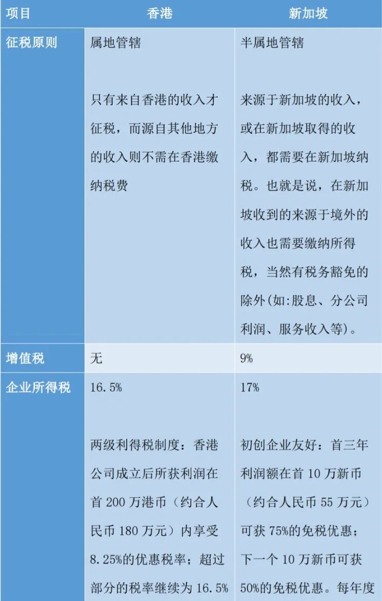 就企业所得税而言,从表面上看,香港 16.5% 的税率较之新加坡的 17% 要更胜一筹。但新加坡看重对小型企业的扶持,利润低的初创企业若在新加坡注册则有较大税收优惠;而对于中大型企业,香港的低税率有更大的优势。