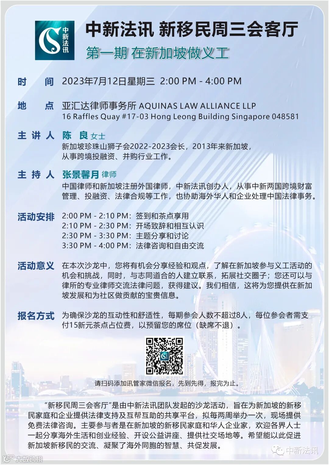 2023年7月12日,“新移民周三会客厅“系列活动的第一期沙龙在AQUINAS LAW ALLIANCE LLP 新加坡亚汇达律师事务所成功举办,这场以“在新加坡做义工”主题的活动,吸引了众多志同道合、热爱公益的新移民的踊跃参与,与会者了解了在新加坡做义工、为社区做贡献的公益途径之一,也借此机会分享在新加坡创业和生活的经验。