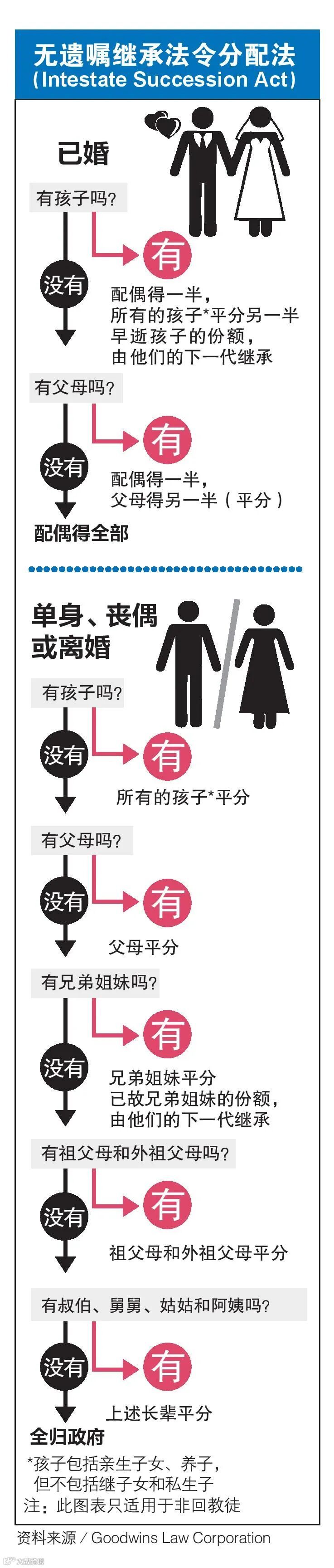 在新加坡,如果死者没有留下遗嘱或者有遗嘱但遗嘱未获得法律认可的,都称为“无遗嘱死亡"(intestate),将会根据《无遗嘱继承法》(Intestate Succession Act)中的规定对遗产进行分配。