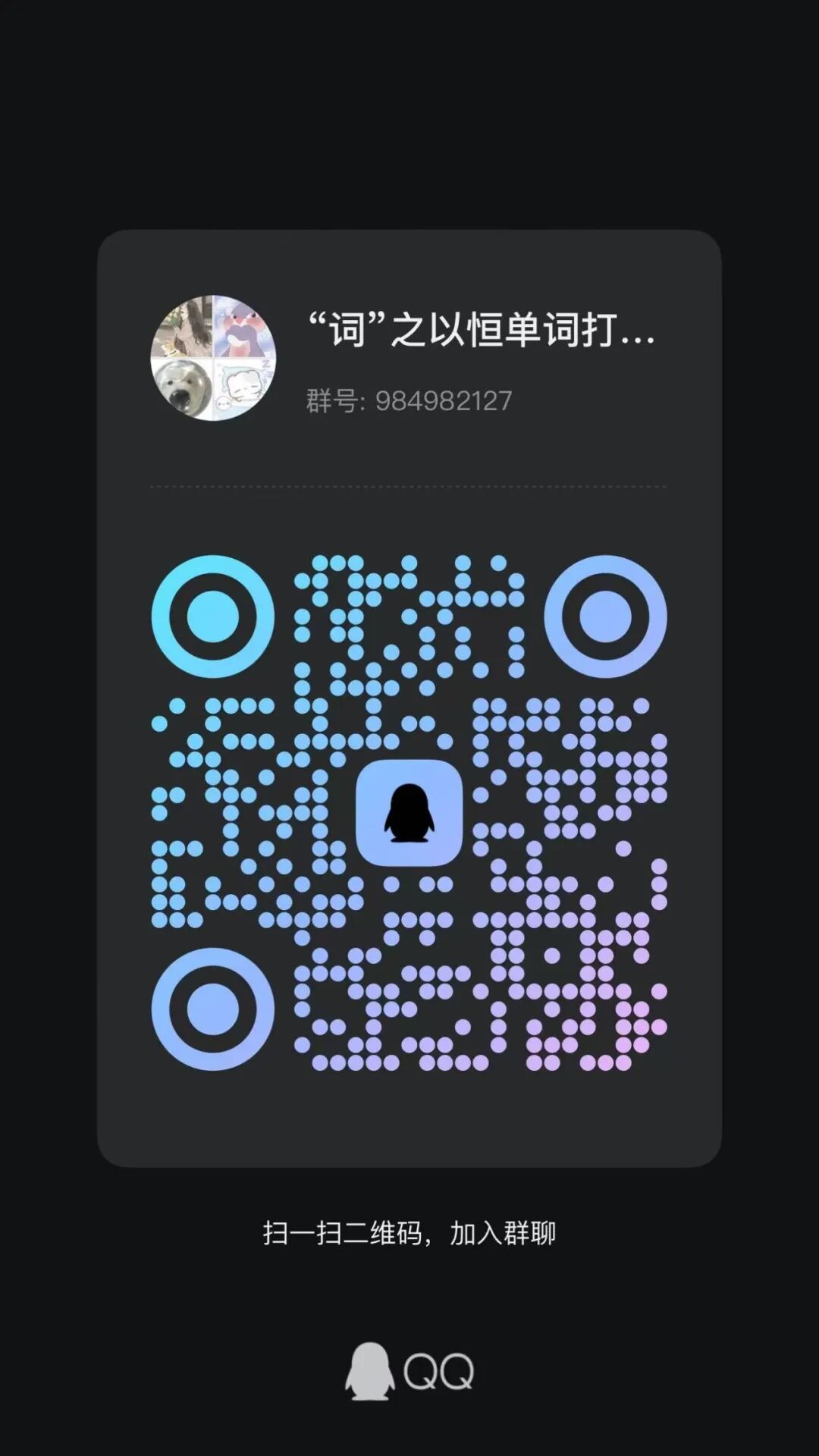 扫码加入QQ群,每日在单词APP完成单词任务后分享至群中,完成打卡人员将获得“青春长大”课外实践学分和精美纪念品。注意:借助背单词软件(如百词斩、不背单词、扇贝单词等可以进行每日单词打卡并显示所背单词数量的APP)进行每日单词打卡。打卡完成后,将个人APP打卡成功分享到QQ群中,完成当天统计。单词数量可根据个人情况自行决定,但不少于30个。