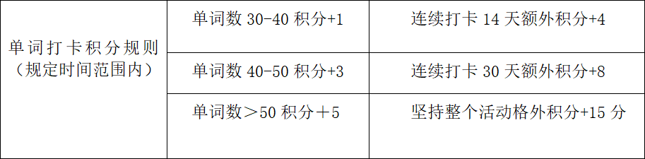 每次单词打卡数量必须达到30个及以上方可加积分,具体规则见下表。