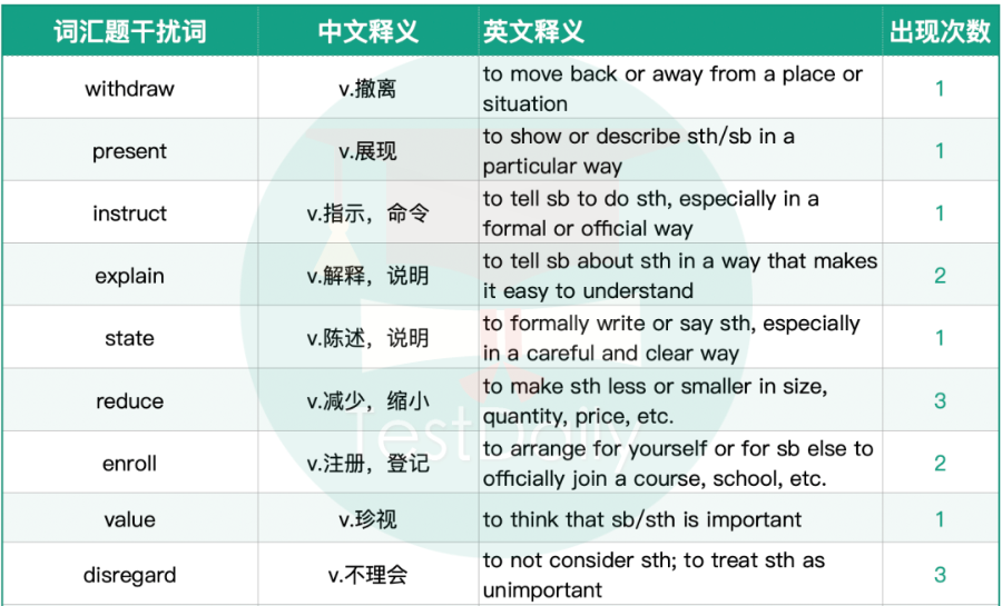 除了将正确答案词提取之外,我们还将所有干扰选项的单词也汇总在一起,补充其常用中英文释义,认识干扰词,有时也能帮助考生通过排除法找到正确选项。