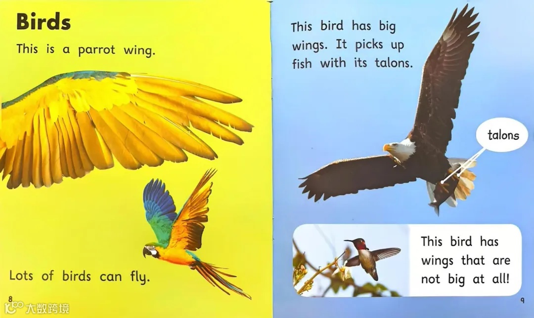 比如鸟类的翅膀wing,鹰爪talon这一类的词语,如果直接给孩子展示单词,那很难记得住,但是如果通过下面这种图文展示给孩子们看,大脑会更加深刻地记忆。