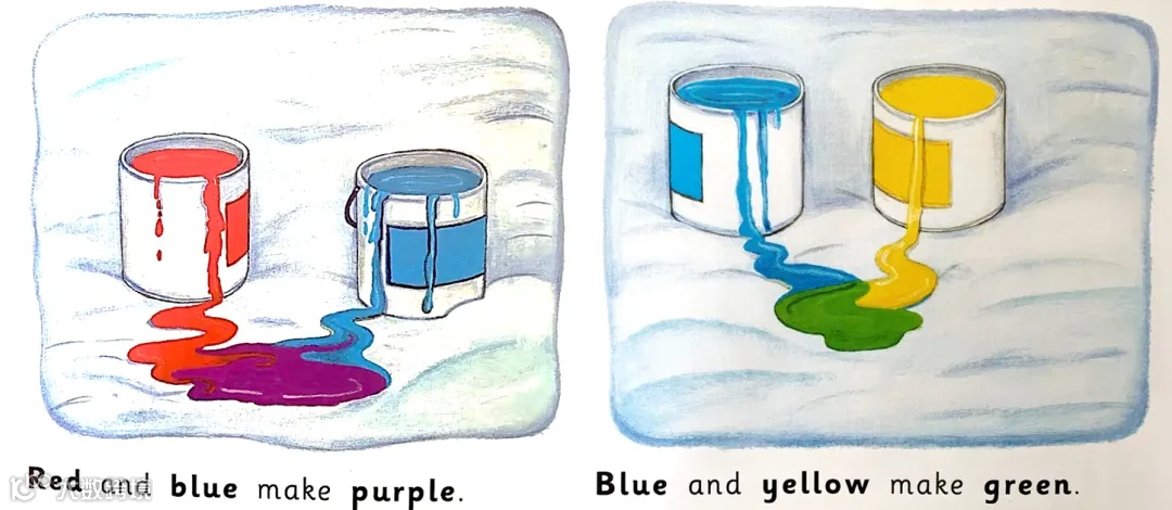 比如:颜色混合后会变成另外一种颜色,孩子们在读不同的读物时,会反复的遇到蓝色和红色混合会变成紫色,Red and blue make purple. Mix blue and red. It's purple.