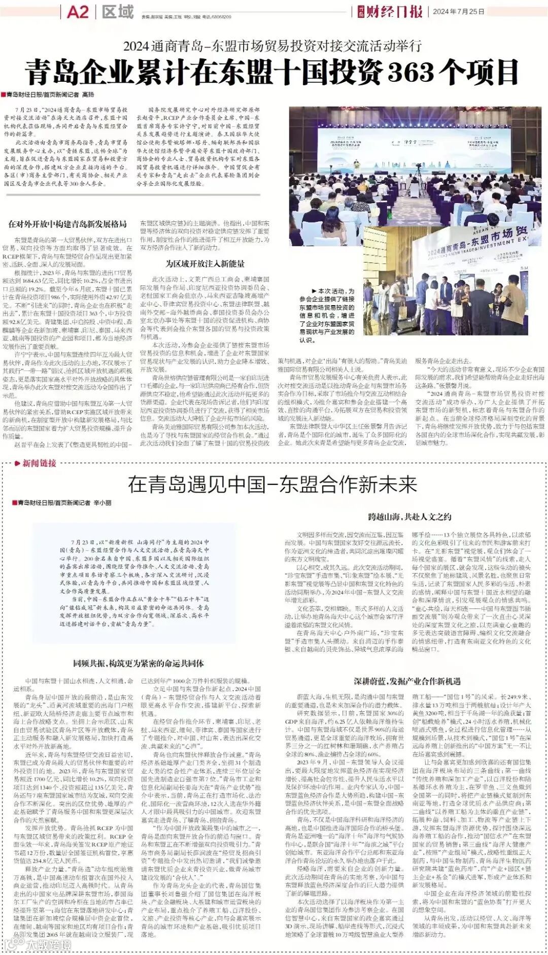 按:7月23日,以“新质新程,山海同行”为主题的“2024中国(青岛)-东盟经贸合作与人文交流活动”在青岛海天中心举行。活动由中国-东盟中心、青岛市政府主办,青岛市委外办、青岛市商务局、青岛市文化和旅游局、青岛国信集团承办。活动围绕经贸合作推介、人文交流活动、青岛市重点项目参访考察三个板块,各方深入交流研讨,沉浸式体验,以青岛为平台,共同推动中国和东盟区域经贸、人文合作高质量发展。