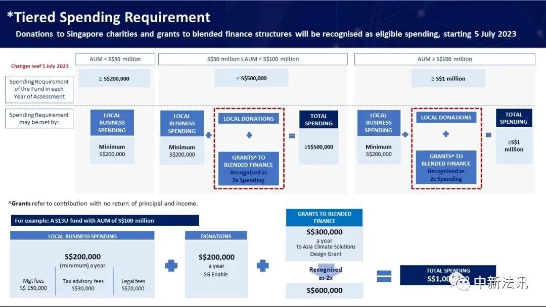 如果家族办公室的资产超过 5000 万新币,开支超过 20万 以上的部分,对本地慈善机构的捐款和本地混合融资项目的赠款(实质参与新加坡金融的机构,此赠款不收回本金和收入),可以纳入阶梯式开支的计算中,并且在计算税收优惠时以投资款的双倍计算,例如,将25万新元捐给慈善机构,则在统计时按照50万新元计算。