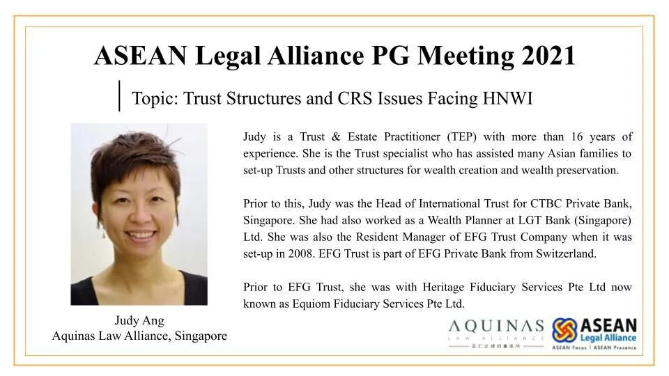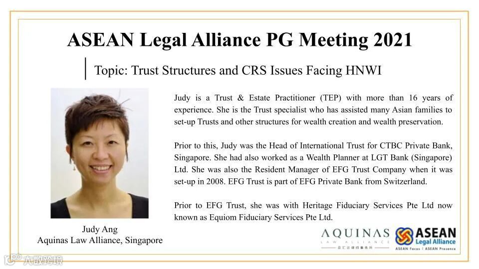 Ms Judy Ang 洪已媛女士 新加坡亚汇达律所金融团队信托顾问,具有16年海外信托设立和家族传承规划经验,持有英国认证的信托遗产规划师从业资格证。