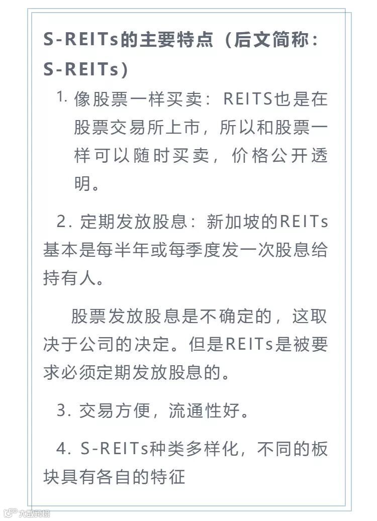 首先,REITs的中文学名是“房地产投资信托基金”,它是由拥有房地产的公司成立的(如凯德CapitaLand, MapleTree, Frasers等),这些房地产包括购物中心、写字楼、工业仓库、酒店、住宅等。通过REITs,你能以负担得起的价格,拥有这些不同种类的房地产,并以房地产业主的方式获得回报。根据新加坡的税收政策,新加坡REITs必须将至少90%以上的租金收入,当做股息,发放给REITs持有人,以此获得免税优惠。