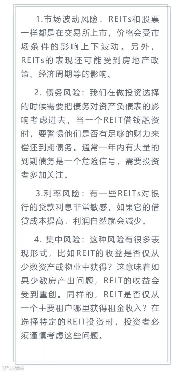 组合投资投资10-30个不同的房地产信托,这样也就把风险分散掉,即使某一个房地产信托出现问题,也不会对整体资金造成毁灭性打击,减低了风险。
