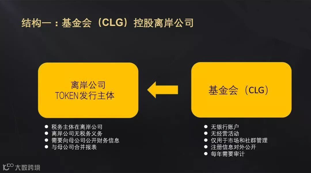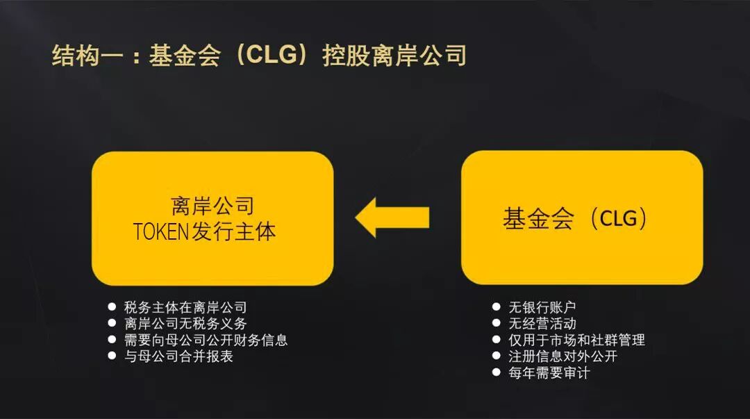 结构一:基金会(CLG)控股离岸公司,离岸公司为token发行主体,新加坡基金会对其100%控股同时维持非盈利属性。该结构税务主体在离岸公司,所以应当服从主体所在国的税务制度,好处是离岸公司无税务义务。